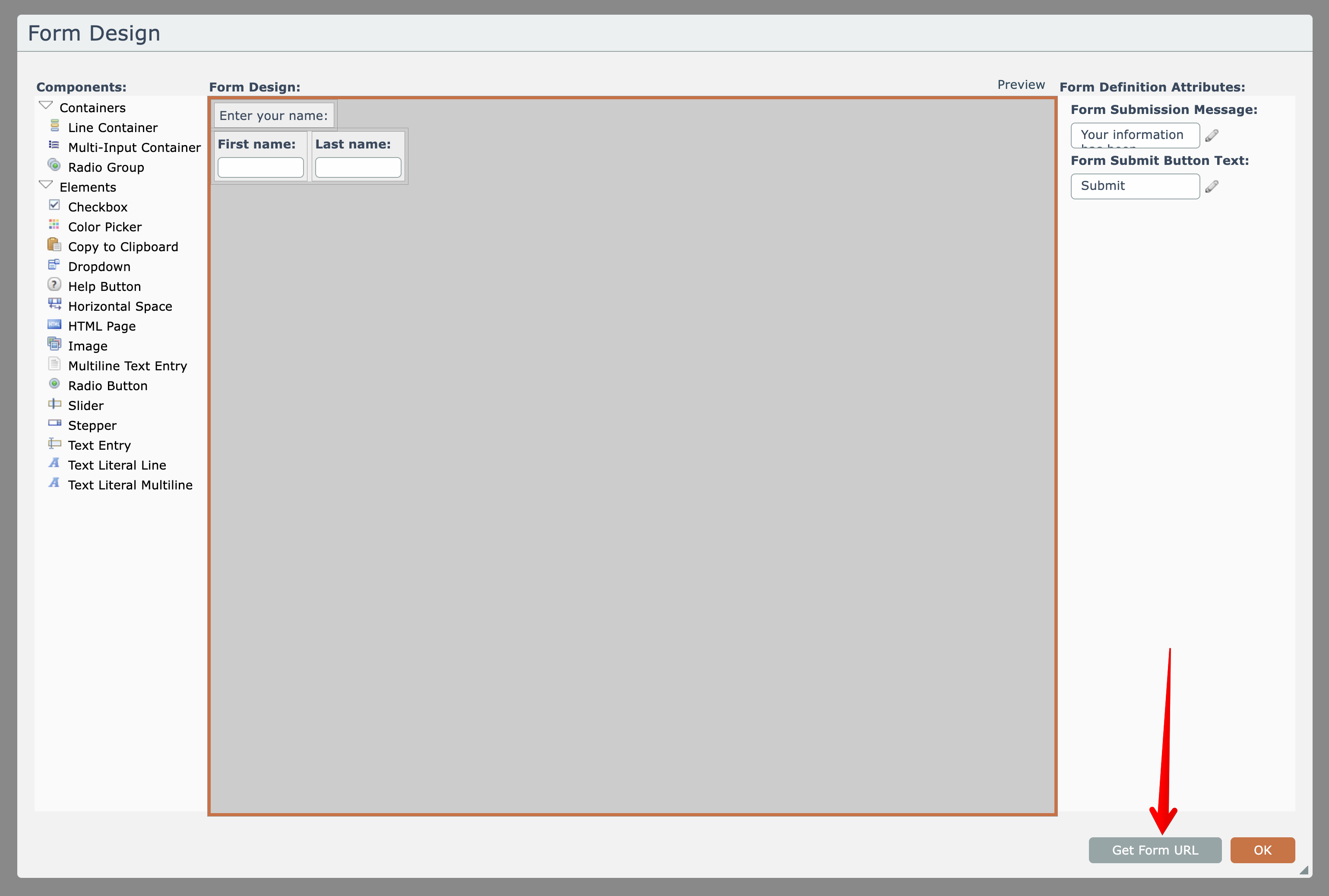 The drag-drop form designer lets you design your form and preview it.