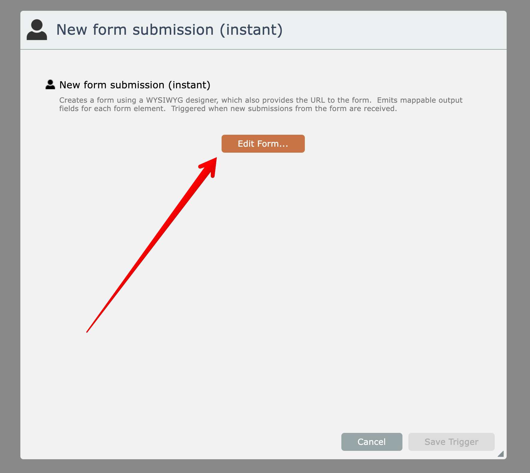 Form triggers are where a URL to a form is generated and anyone given that URL can access the form and submit input. A form trigger is like other instant triggers, where the automation's form trigger is fired whenever form entries are submitted.