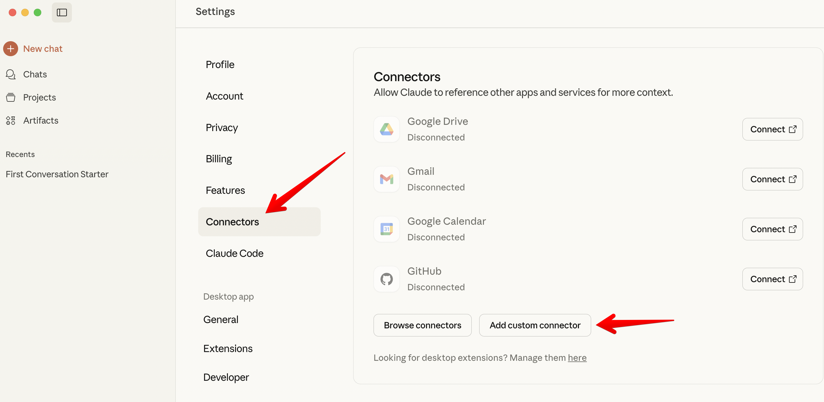 Now you can go to your MCP client and configure it to connect to your MCP tools. For this example, we'll connect it to the Claude Desktop app. Go to Claude's settings,. select Connectors, then add a custom connector: