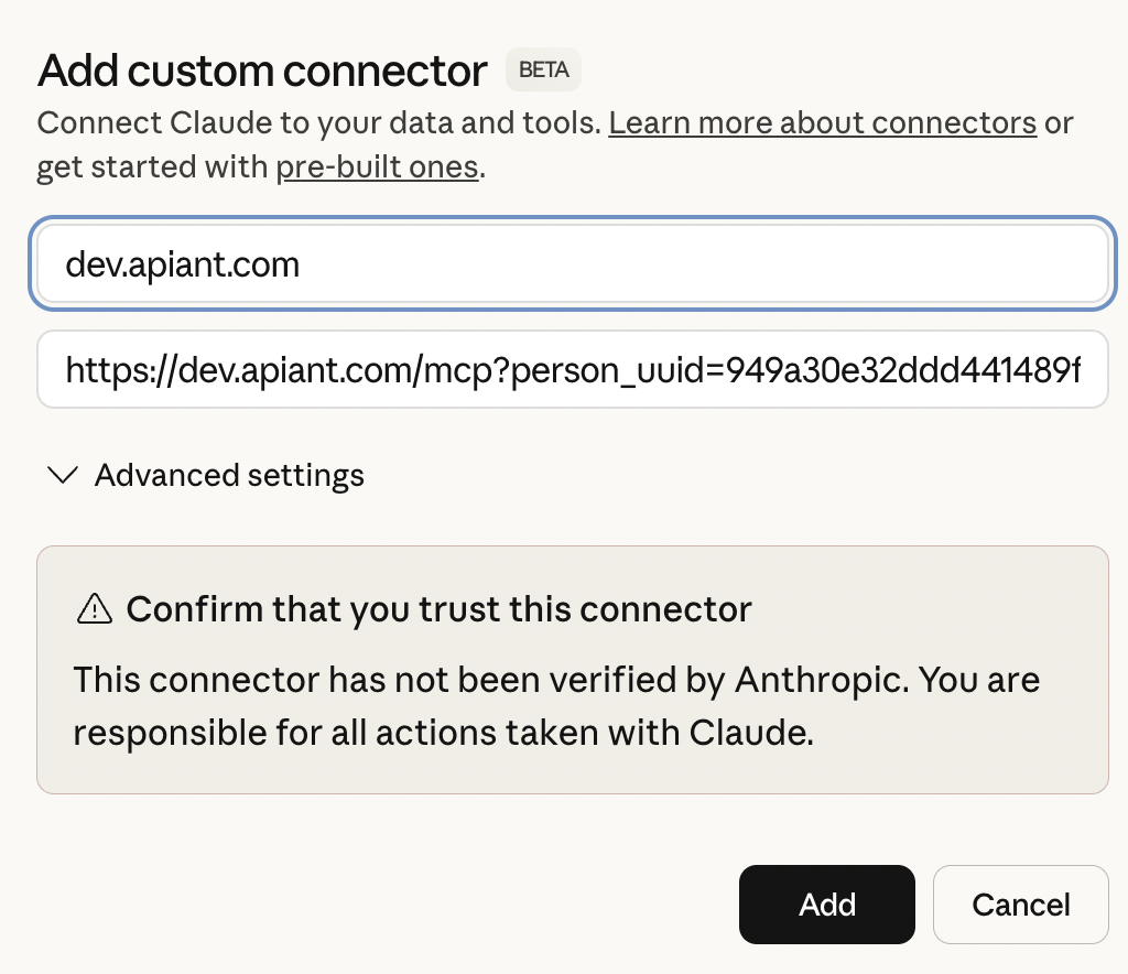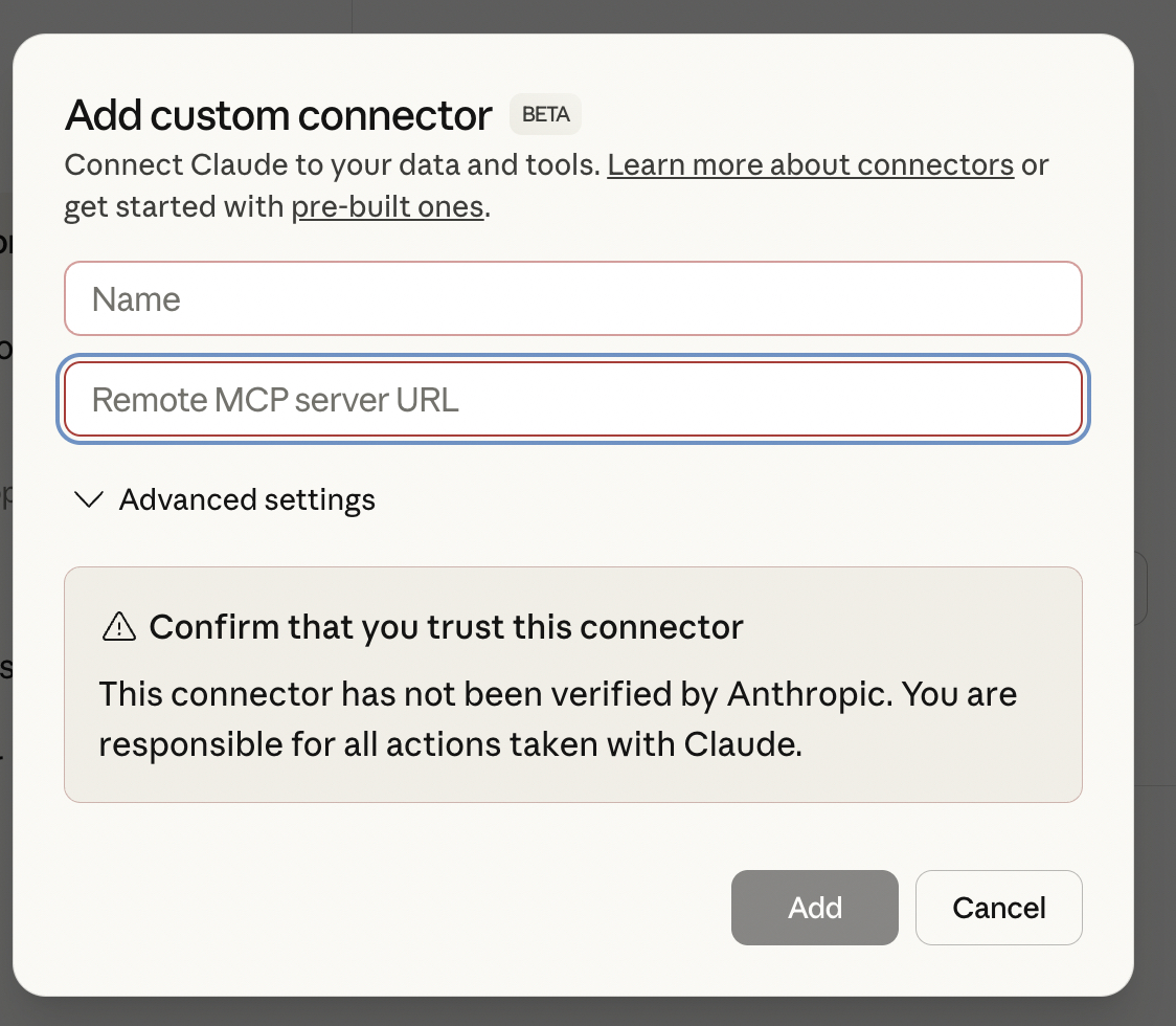 Give the connector a name and paste the MCP URL you obtained from the dashboard: