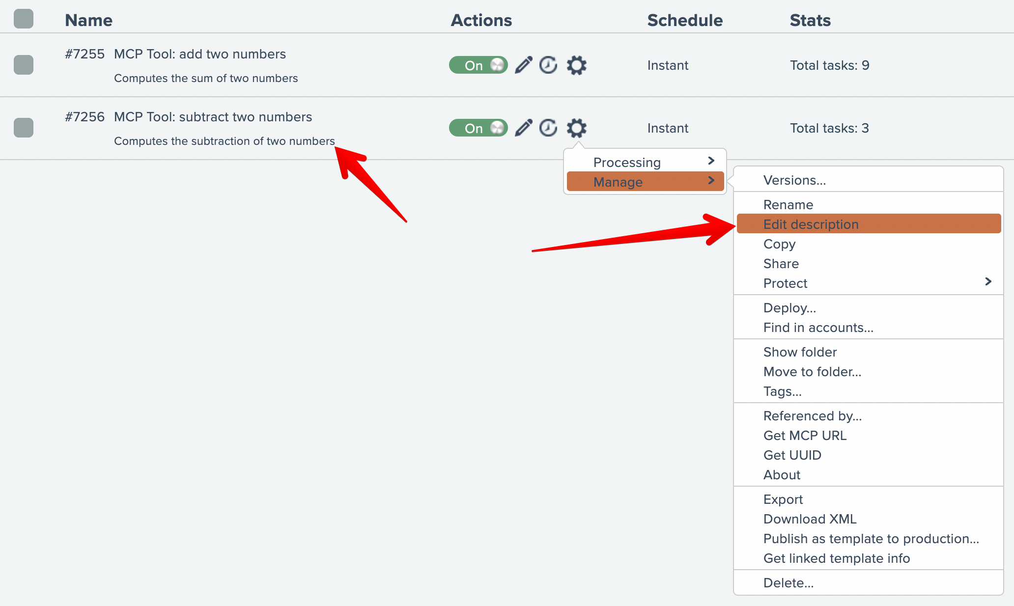 Each MCP tool automation should have description text that informs the AI model the purpose of the tool. If an automation does not yet have description text, choose the gear menu option shown below, otherwise just click the existing description text to edit: