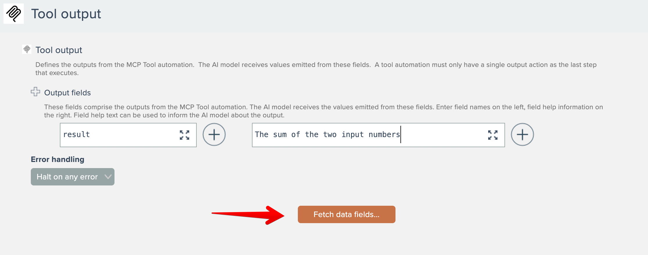 Add one or more input fields for the tool. Enter field names on the left, field descriptions on the right: