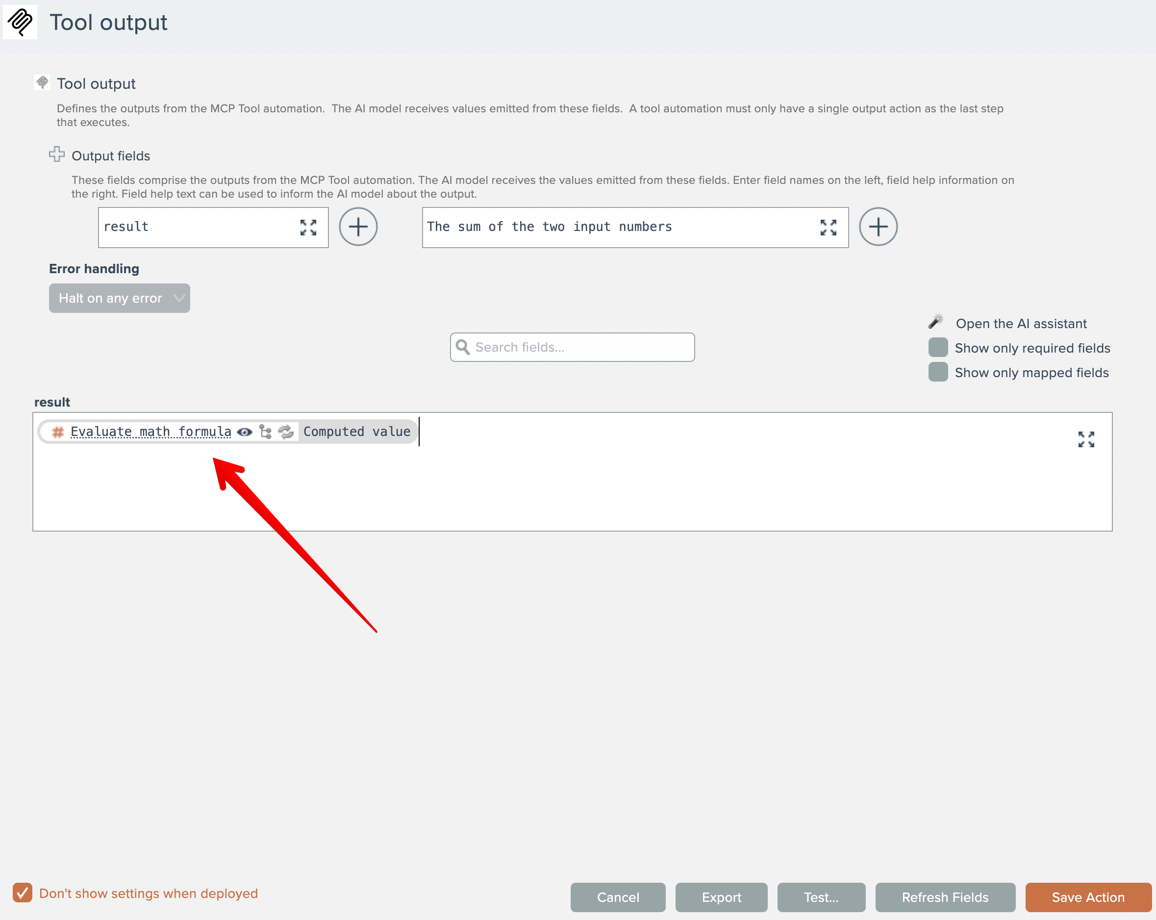Finally, add the MCP output action: