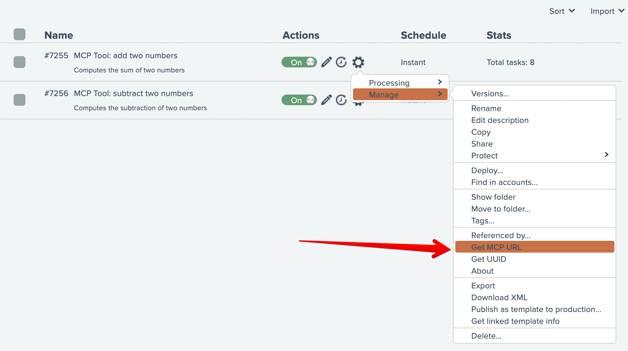 To utilize the MCP tools from MCP clients, they need to have the URL to the system's MCP service. This URL can be obtained from any MCP tool automation's gear menu here: