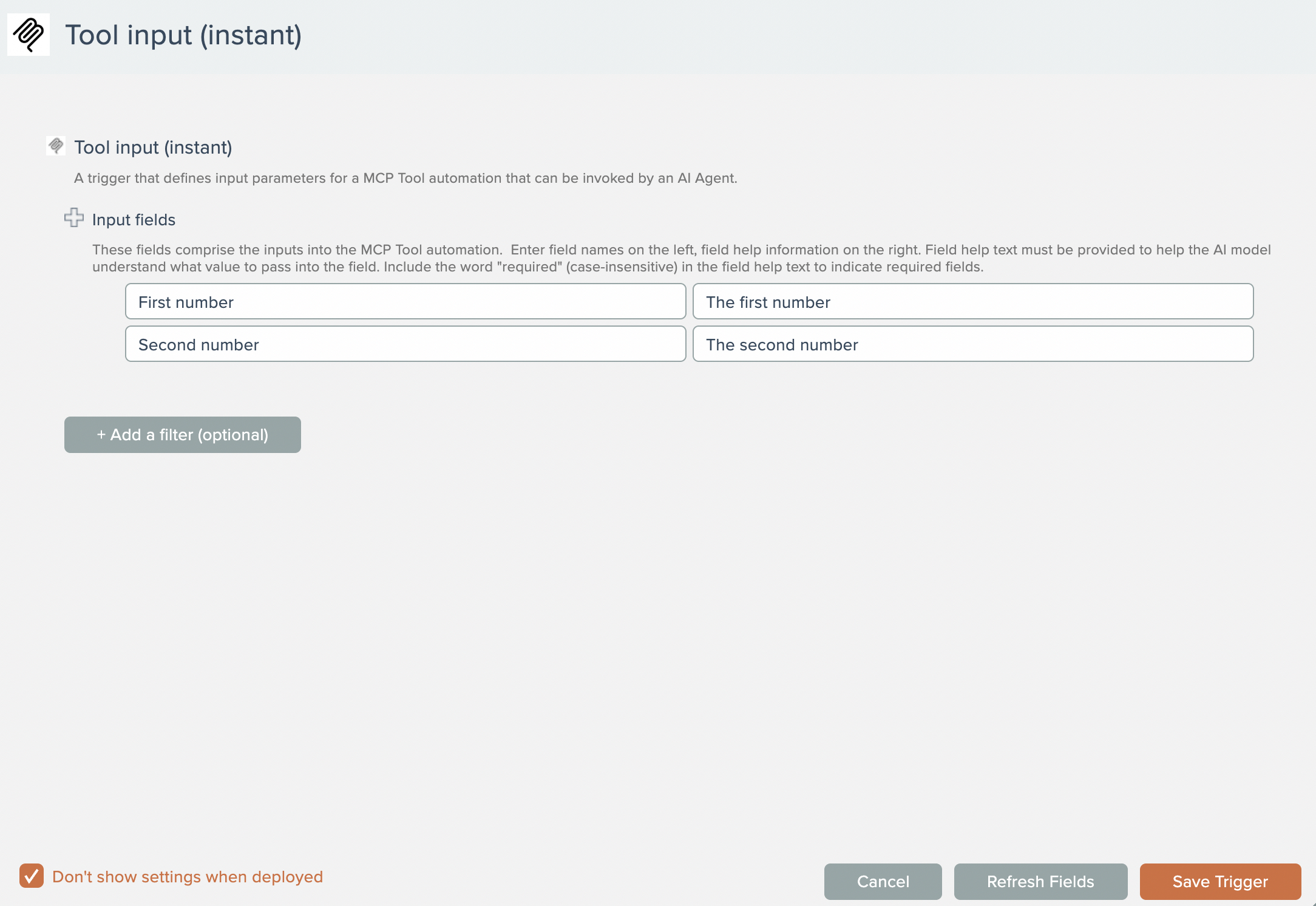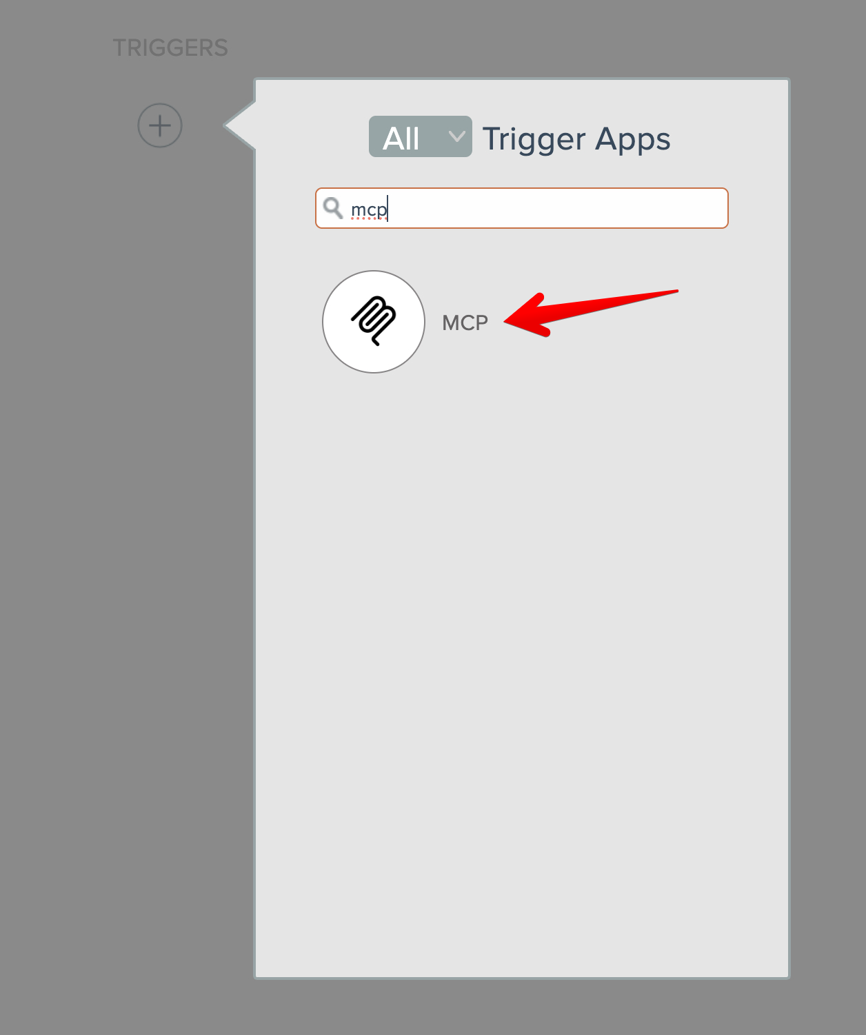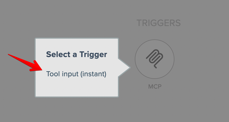 To build an MCP tool automation, begin by adding the MCP app's tool input instant trigger: