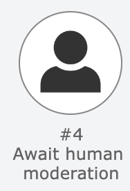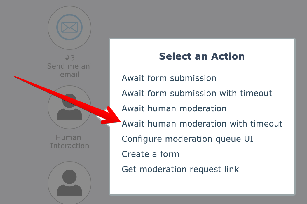 Alternatively, the "await human moderation with timeout" action can be used. This variation will emit a configured default moderation result (e.g. either "approved" or "denied") after a configured amount of time: