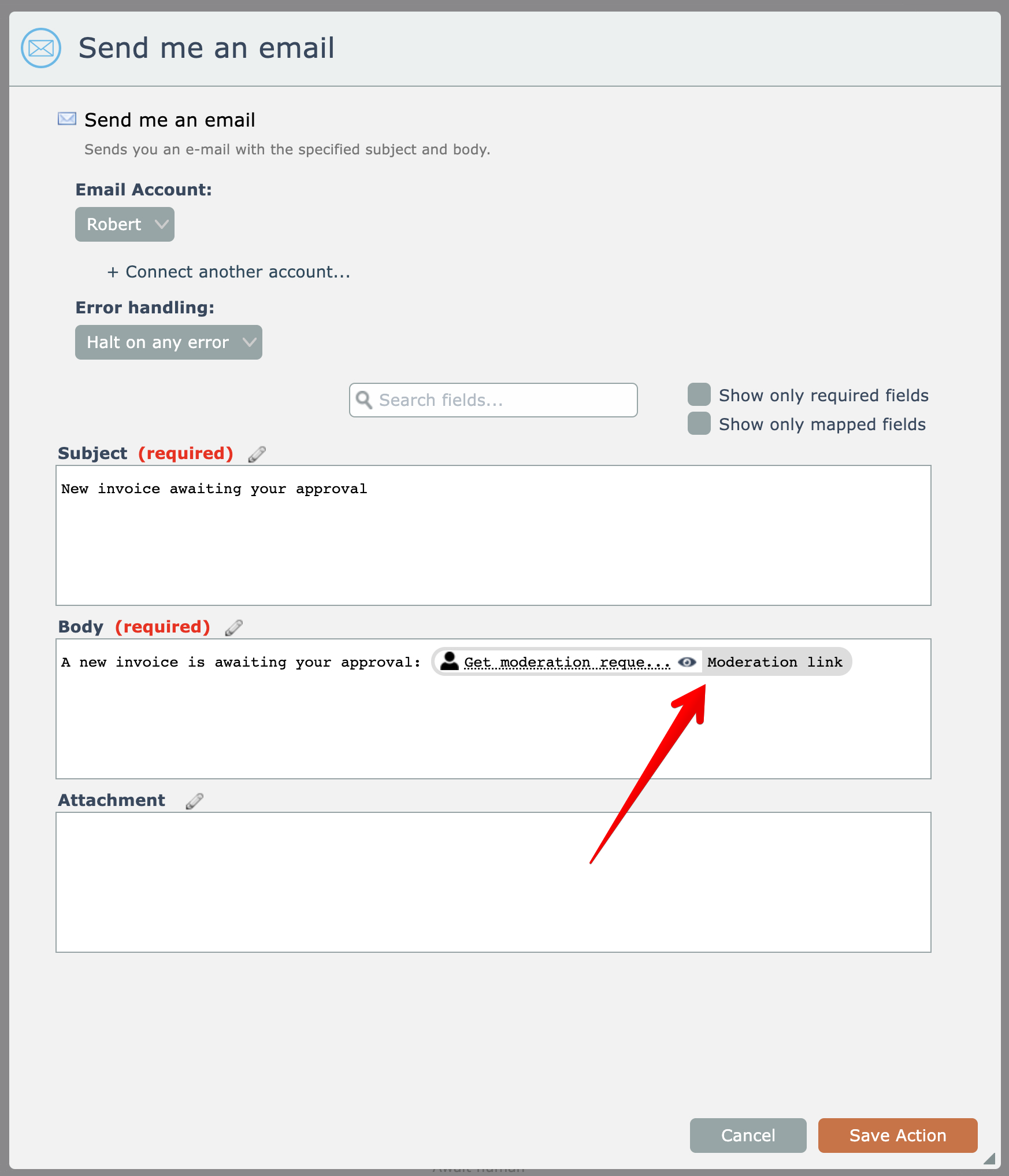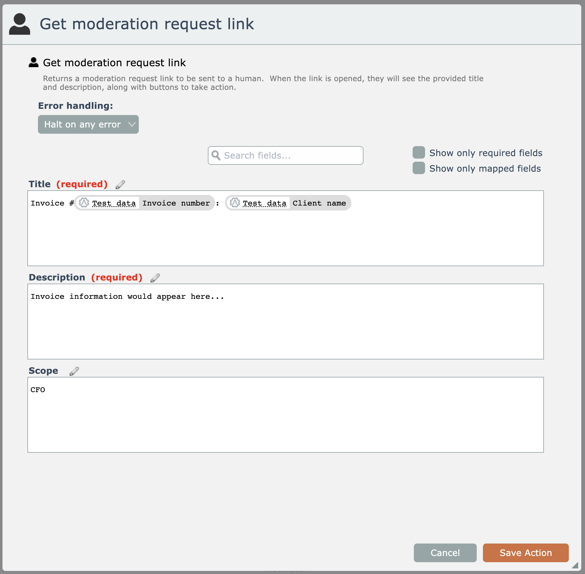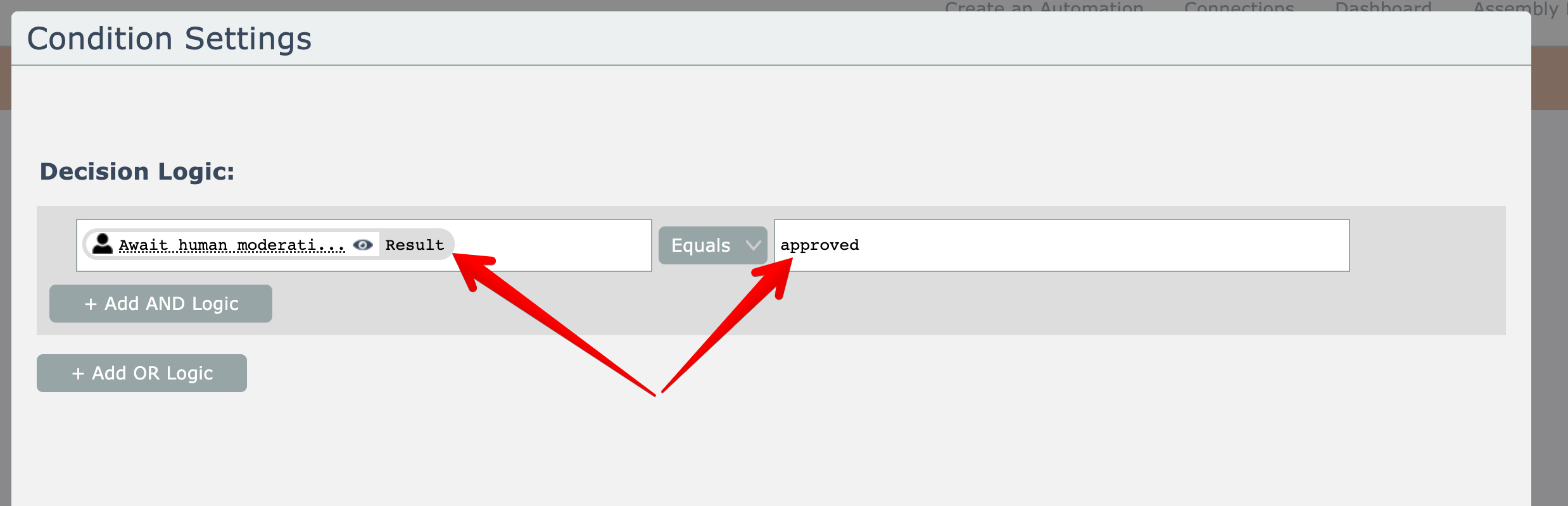 The "await human moderation" action is then used to pause the automation until someone either approves or denies the item: