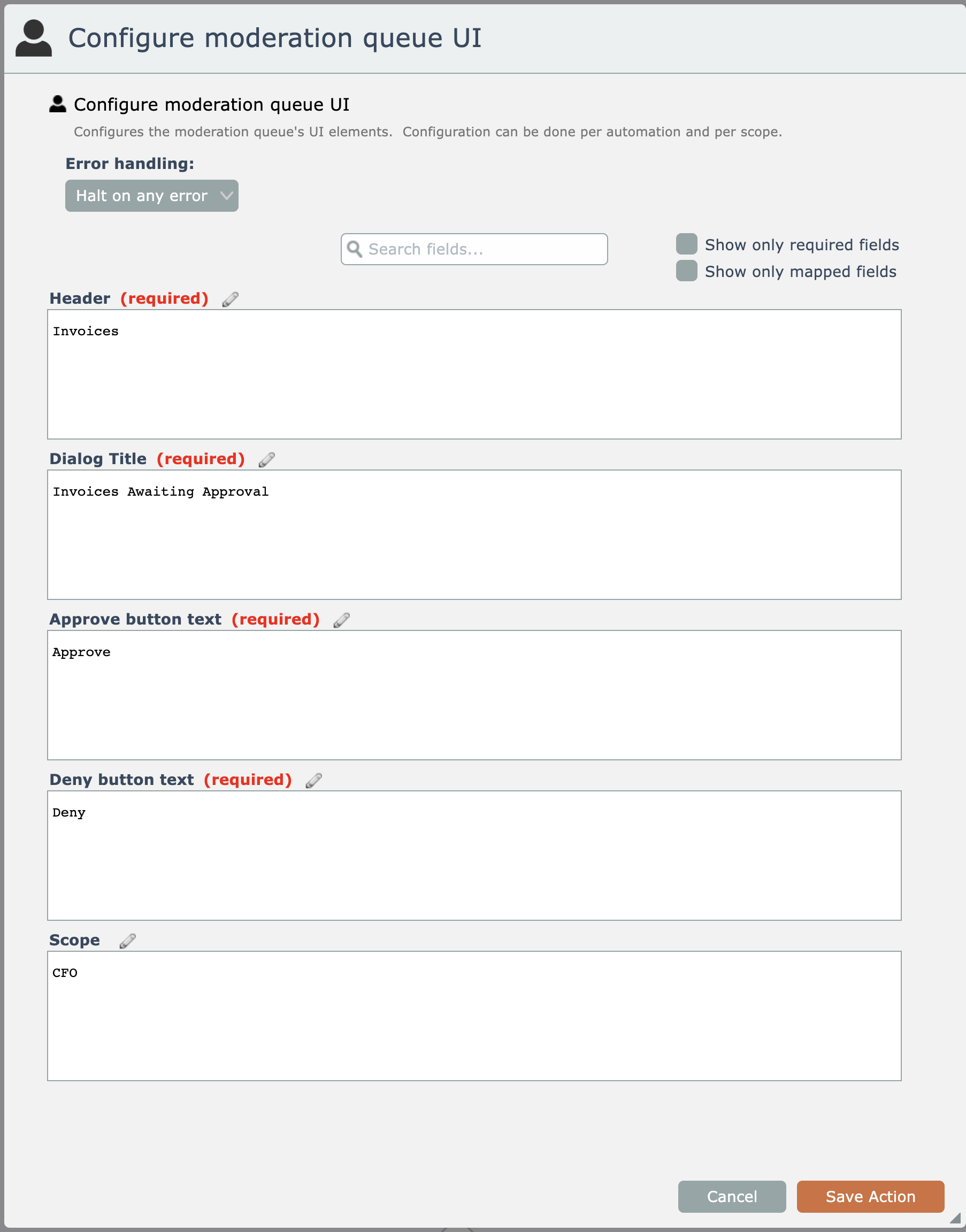 By configuring one queue with a scope of "CFO", only those invoices over a certain dollar amount can be placed into a moderation queue that only the CFO would access, while all other invoices would go into a different queue to be moderated by someone else or even a group of people.