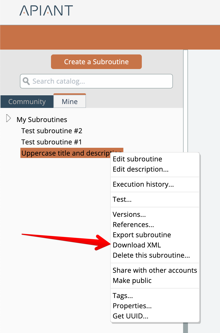 Accounts having the "Assembly Developer" permission can download a subroutine's XML definition by right-clicking on a subroutine and choosing this menu option:
