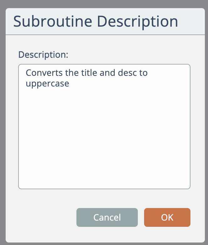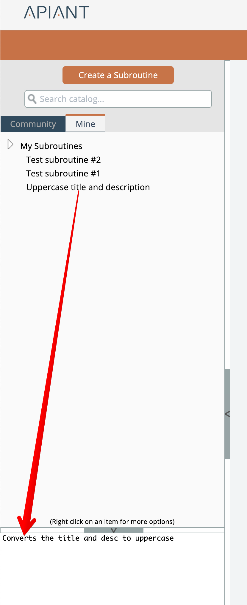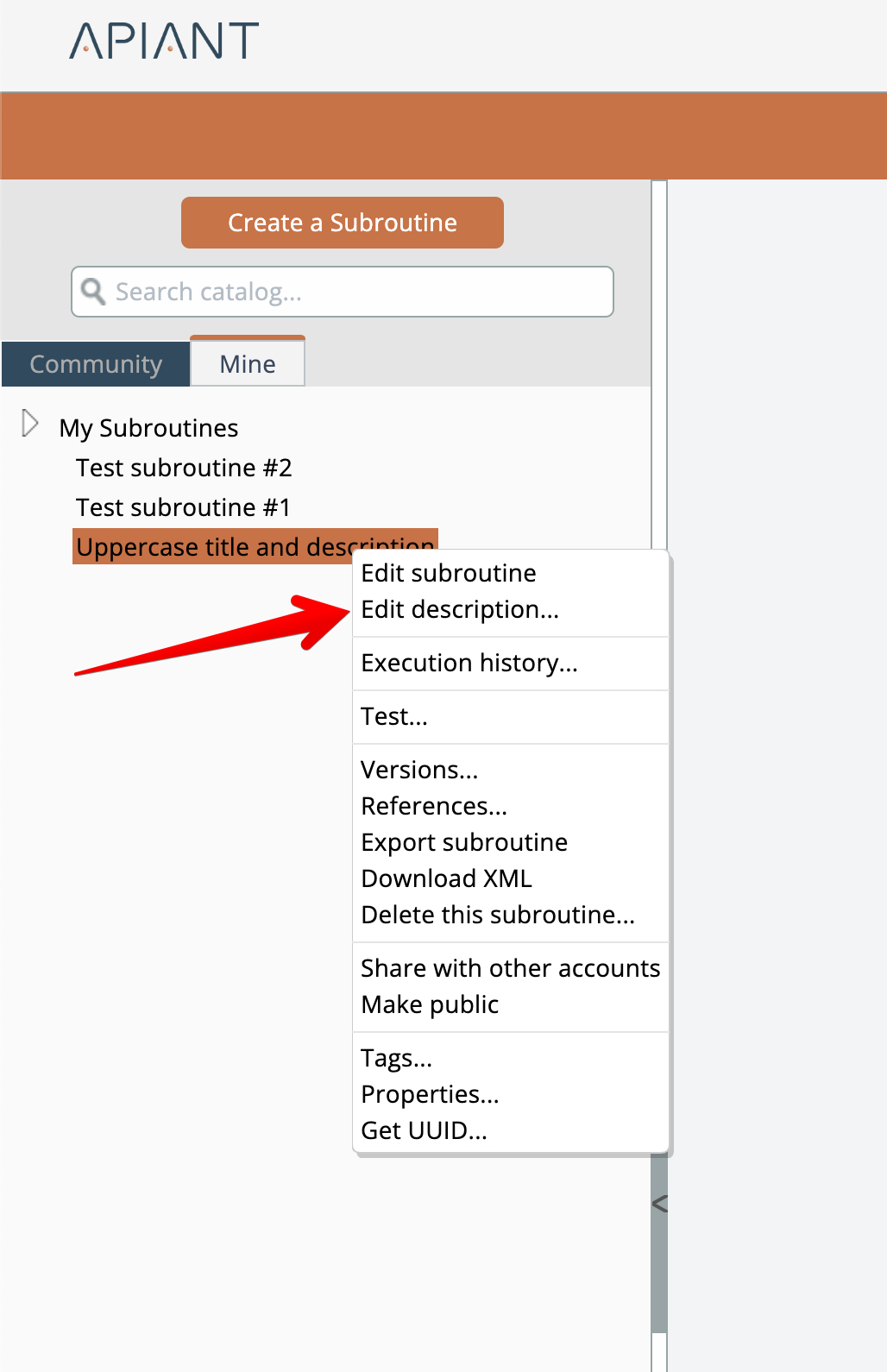 To edit a subroutine's description that appears in the catalog, right-click on the subroutine in the catalog and choose the "edit description" option: