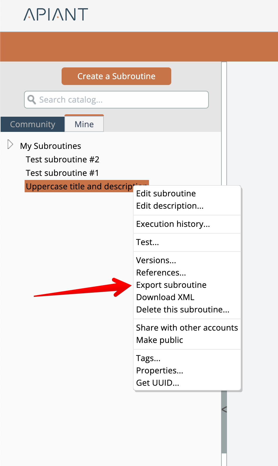 To export a subroutine as a downloadable file, accounts having the "Export" permission can right-click on a subroutine and choose this menu option: