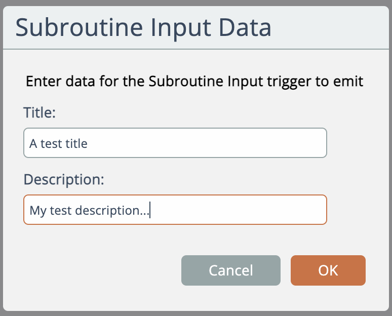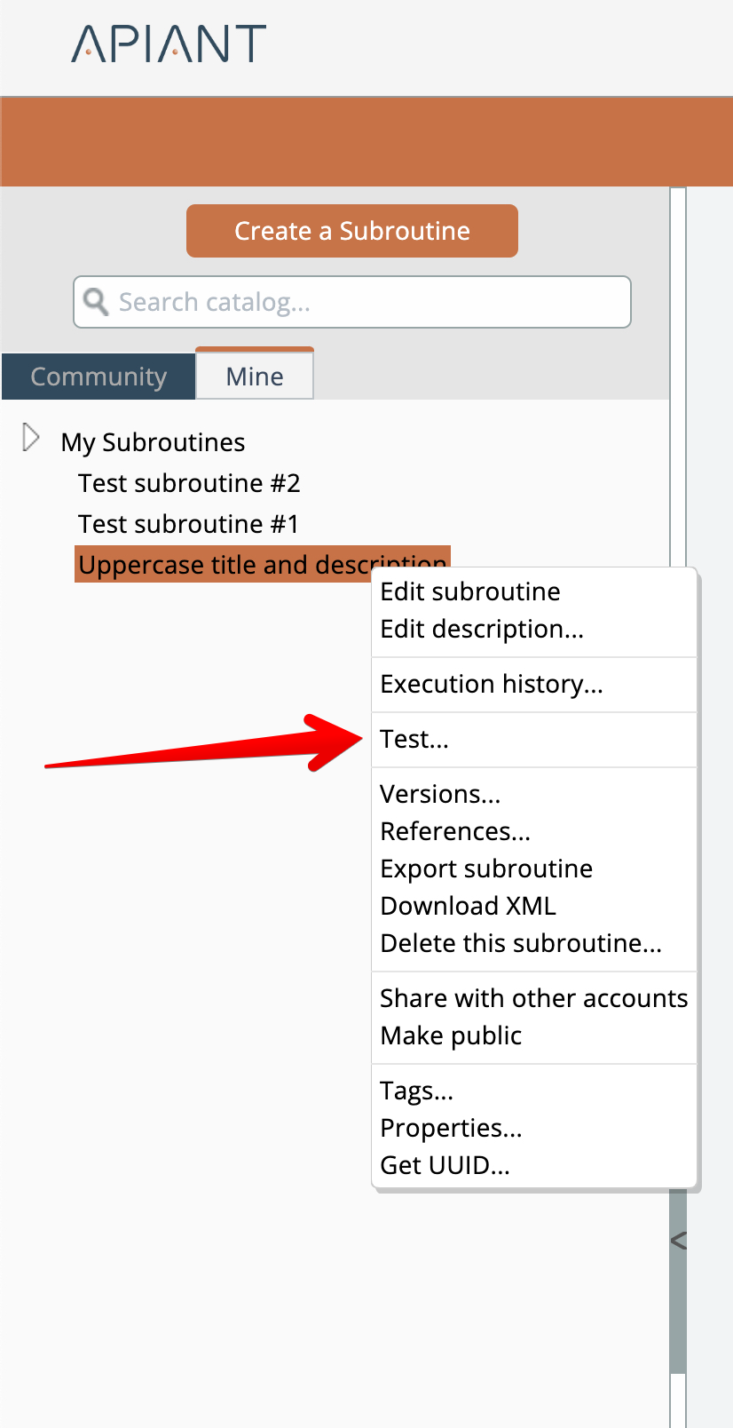Standalone testing of a subroutine can be done by right-clicking on it in the catalog and choosing the Test option: