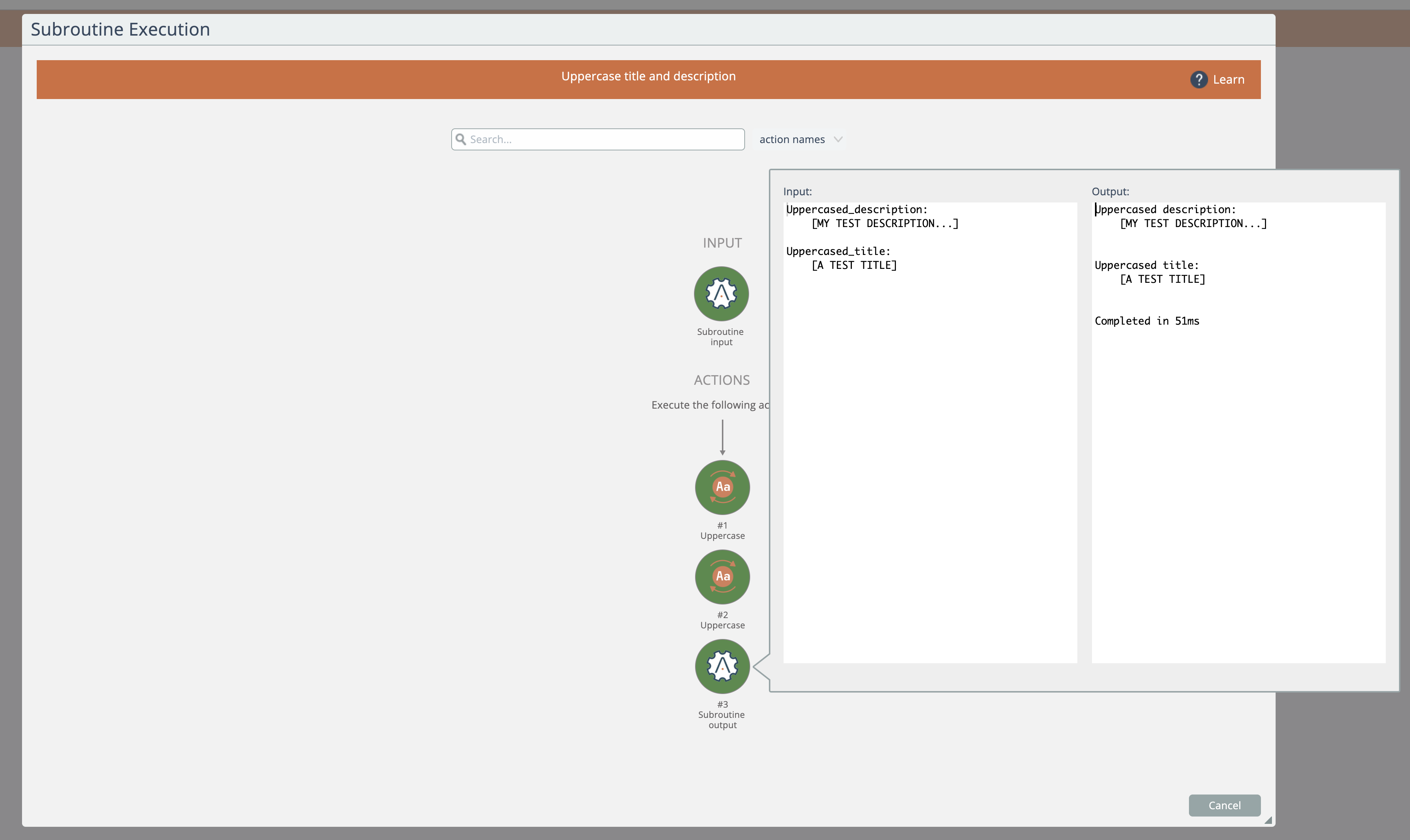 Learn how to test a subroutine by following simple steps. Right-click on the desired subroutine in the catalog, choose the Test option, and enter values for the input fields. Witness the execution of the subroutine alongside a graphical history display. U