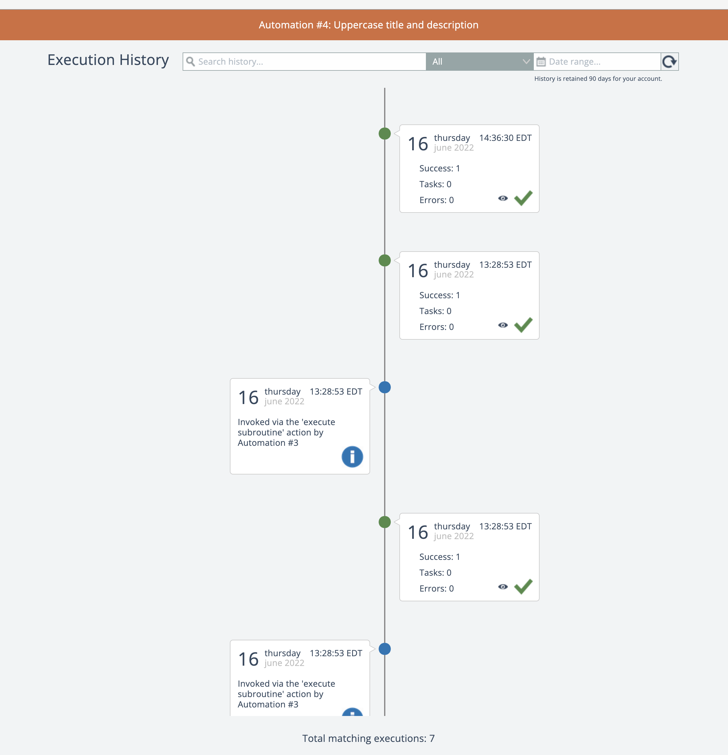 Subroutine execution history is the same as for automations, since subroutines are just a special type of automation. See Execution history to learn how to use the drill-down for subroutine execution history.