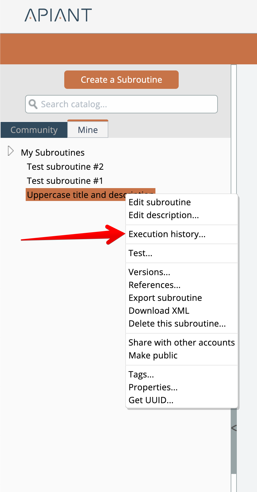 To view a subroutine's execution history, right-click on the subroutine in the catalog and choose the "execution history" option: