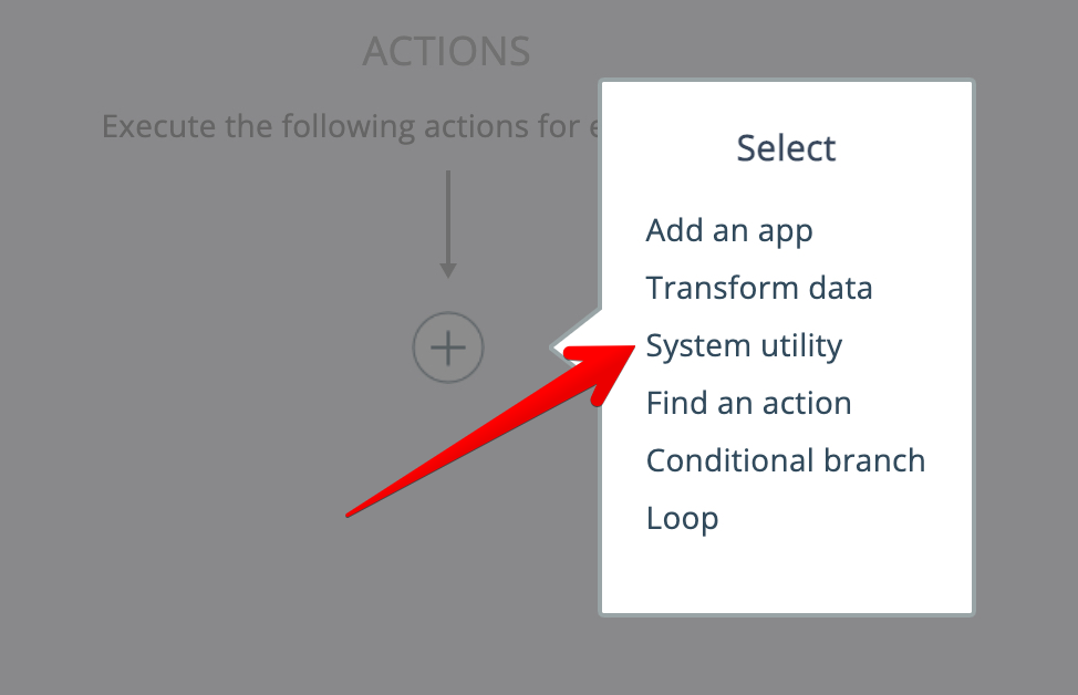 Click the "plus" icon and choose the System Utility category, either as a trigger or an action: