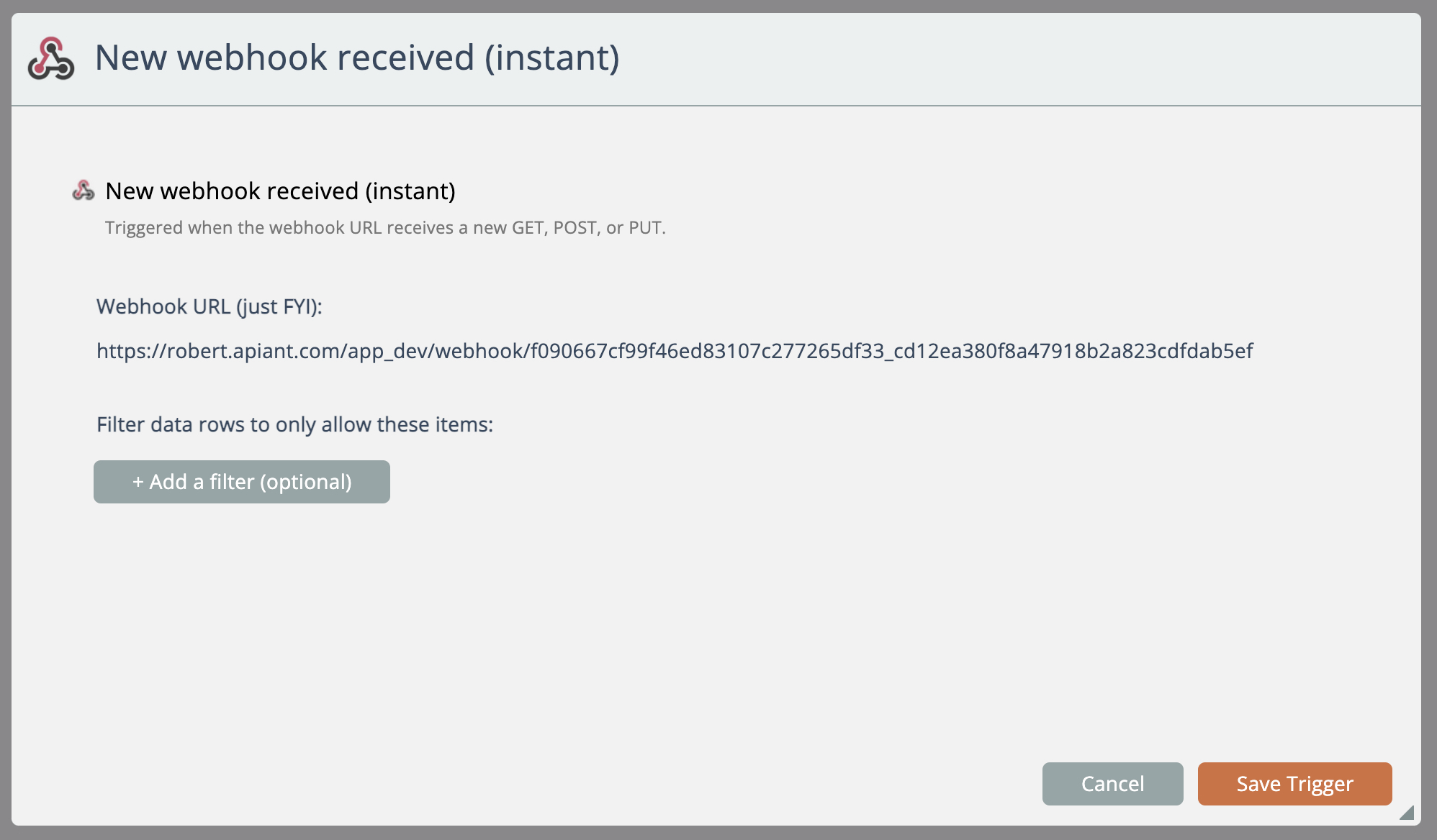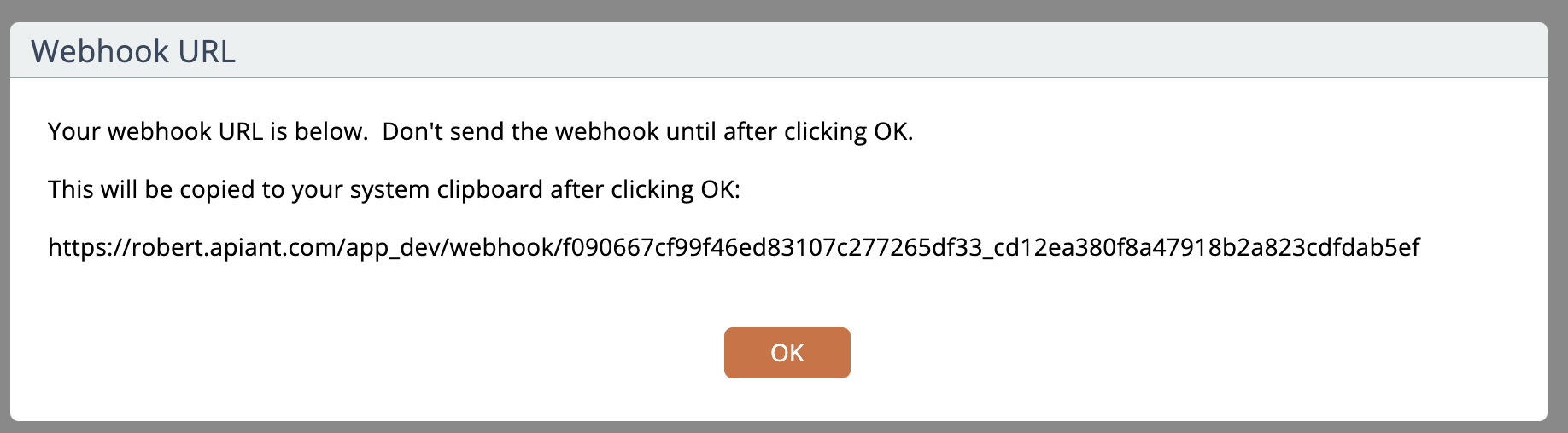 When the trigger is configured it will provide the webhook URL and let you copy it to your system clipboard: