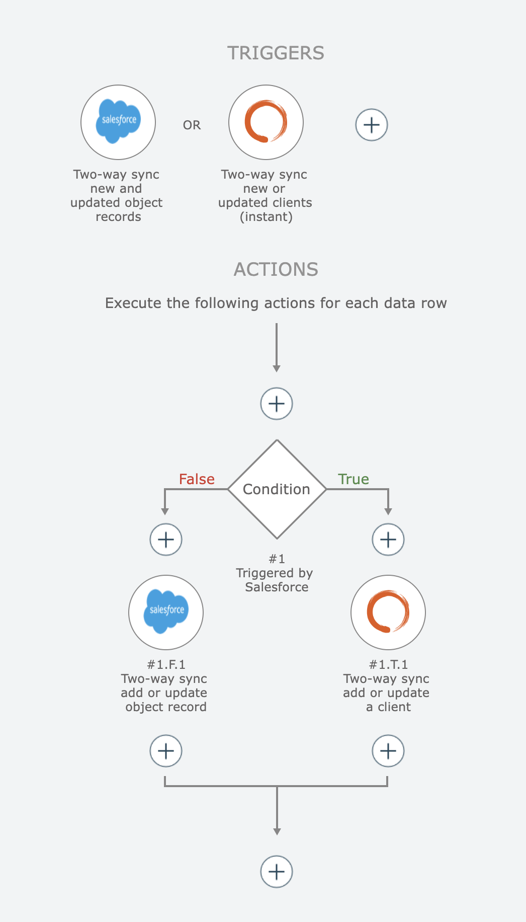 Two-way sync triggers provide functionality to bidirectionally sync data between two systems. They are paired with two-way sync actions.