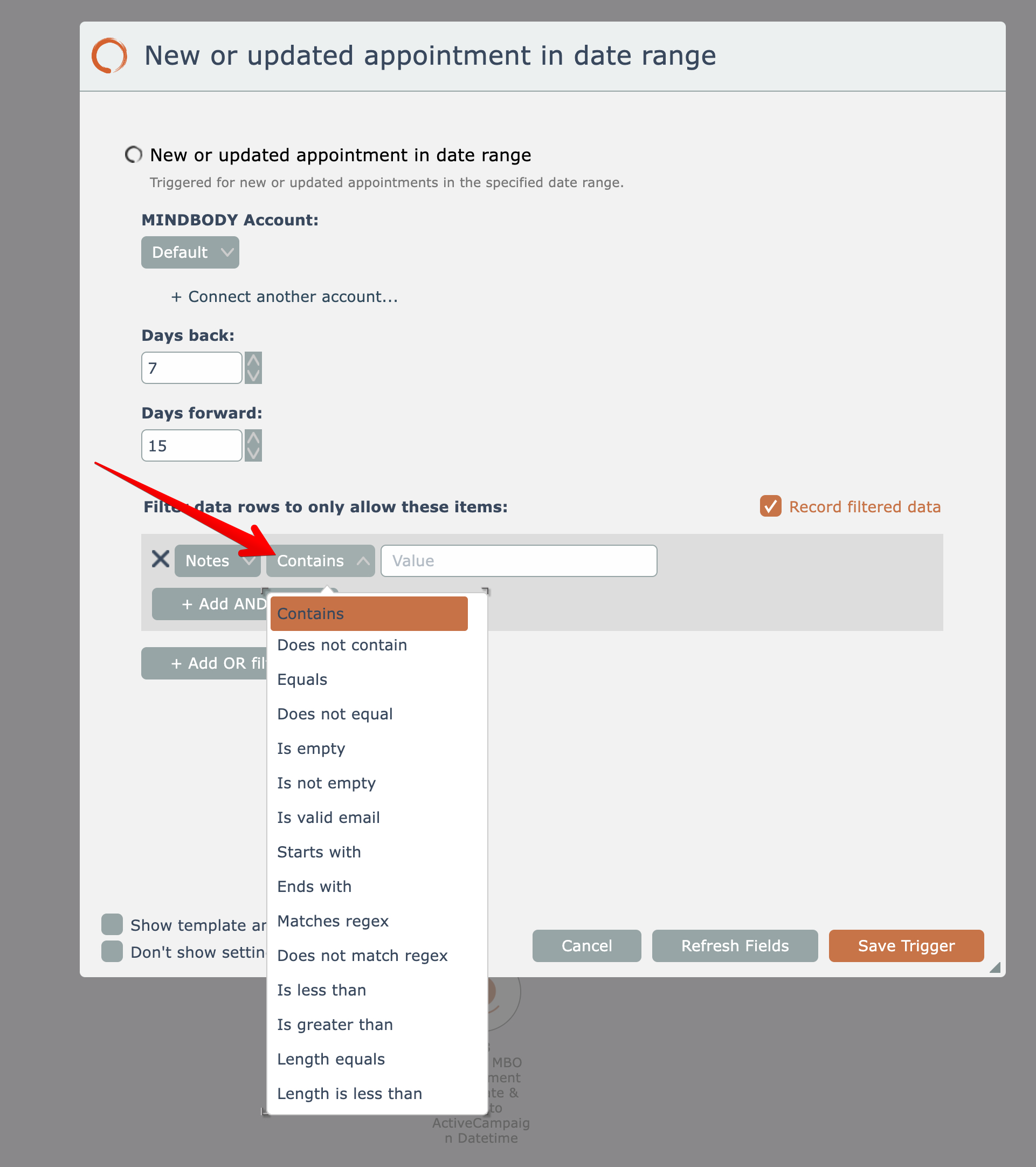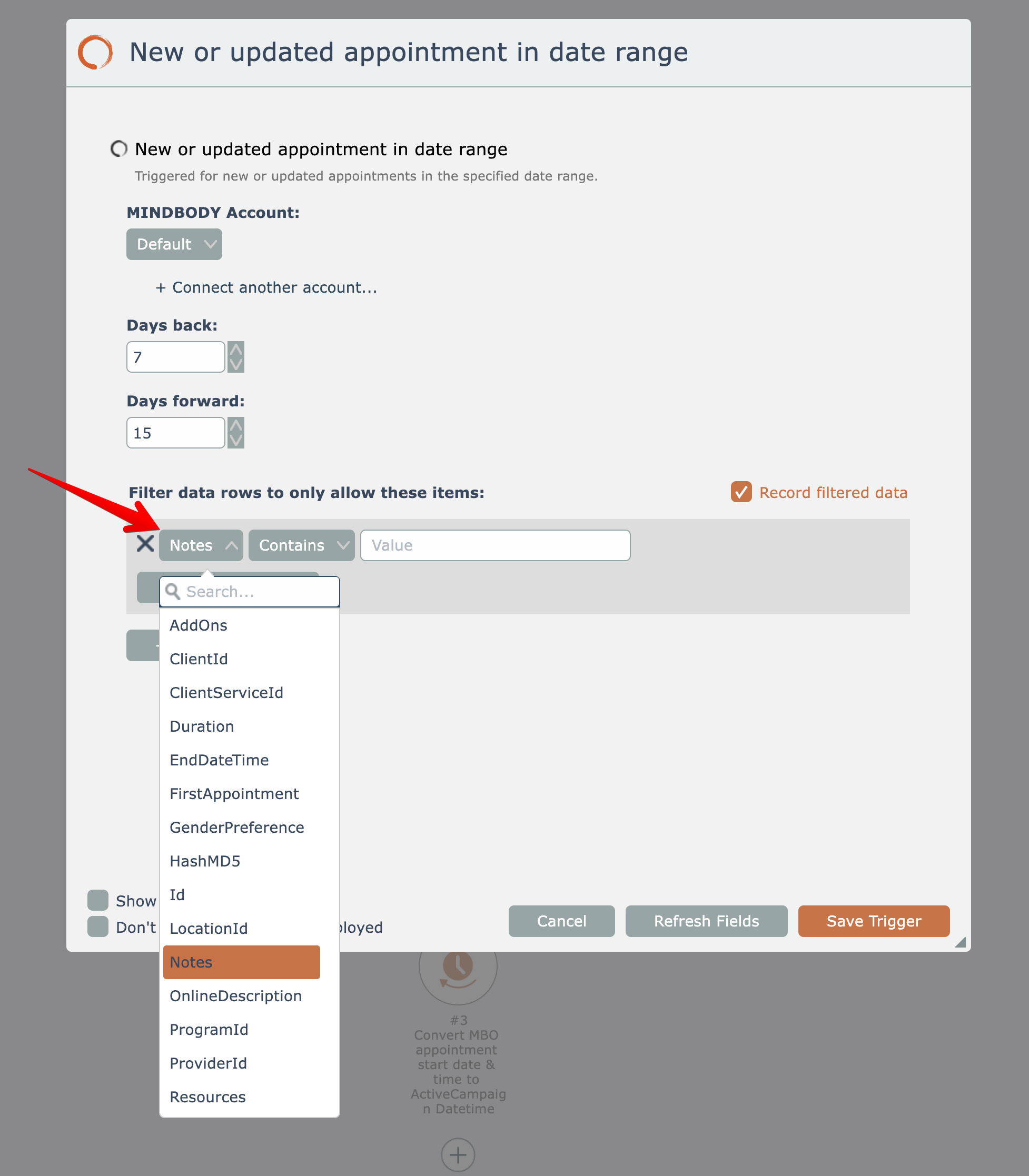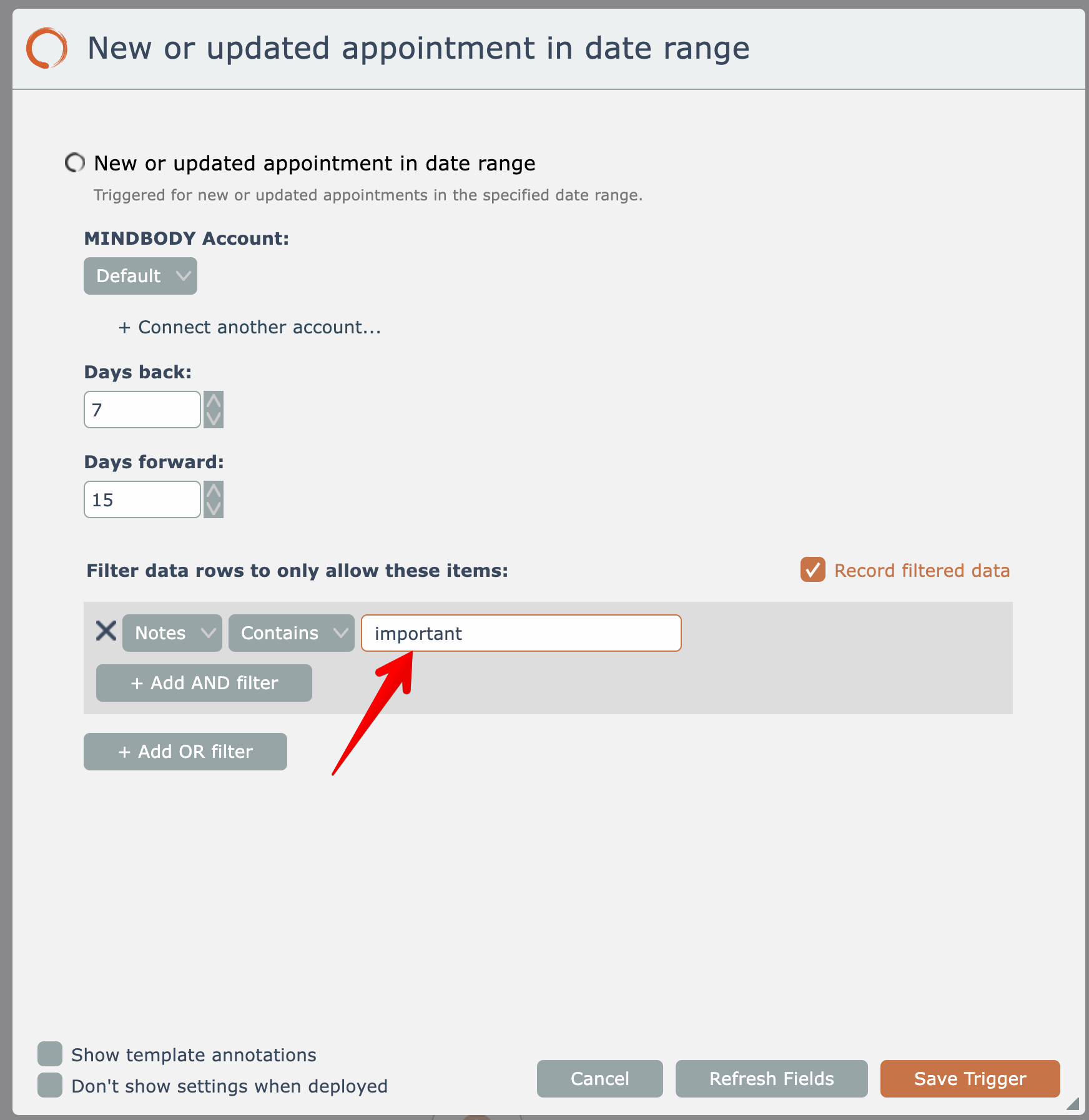 So in the above example, the trigger will only emit new or updated appointments that have a note containing the text "important".