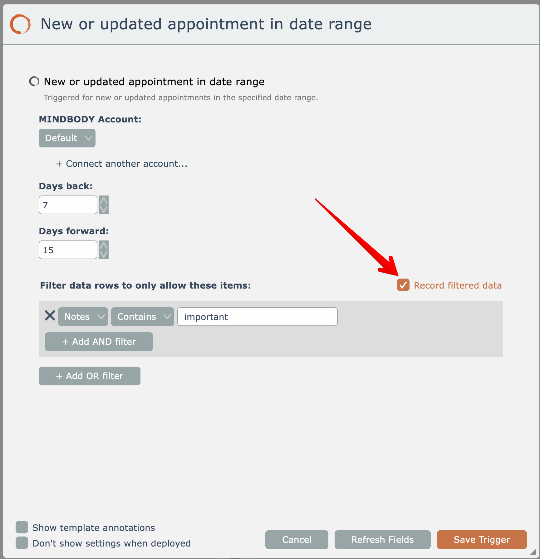 By default, when a trigger filter is configured the system will record filtered data rows: