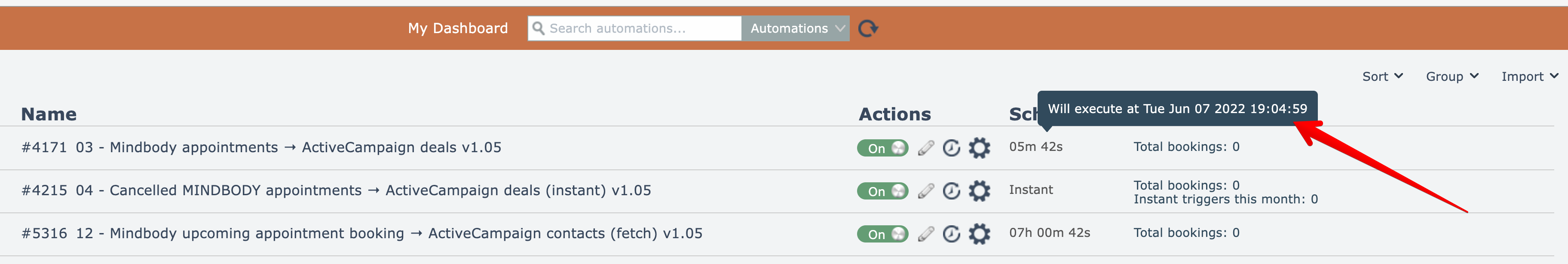 To determine the next time a polling automation will execute, mouse over the countdown schedule timer. A tooltip will appear with the date and time the polling automation will be queued for processing by the system: