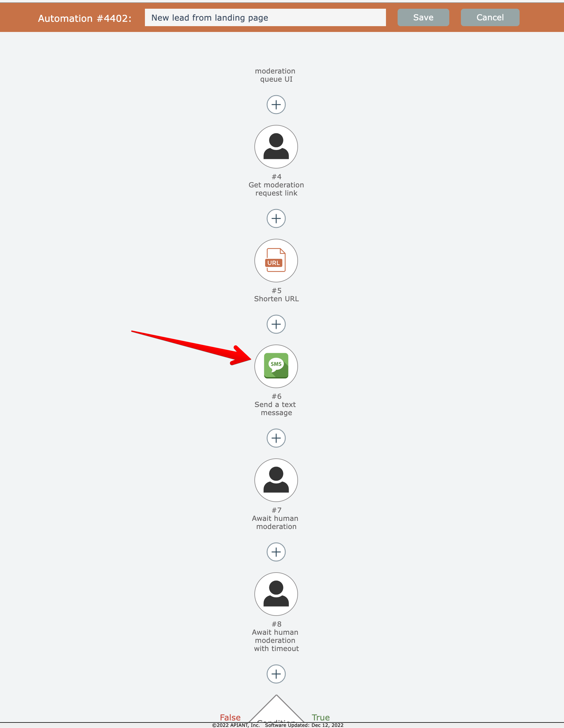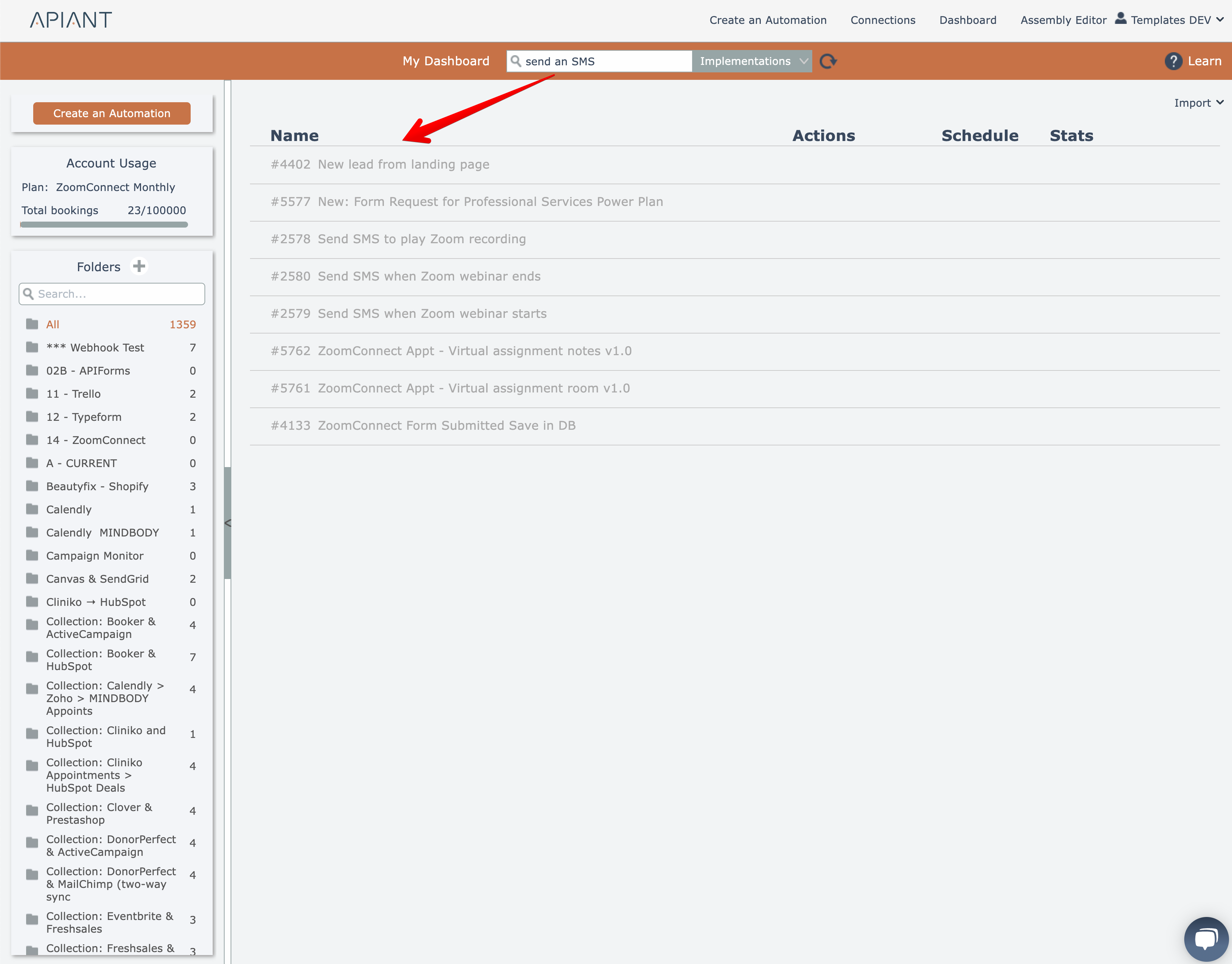 The example search above found automations using a send SMS action: