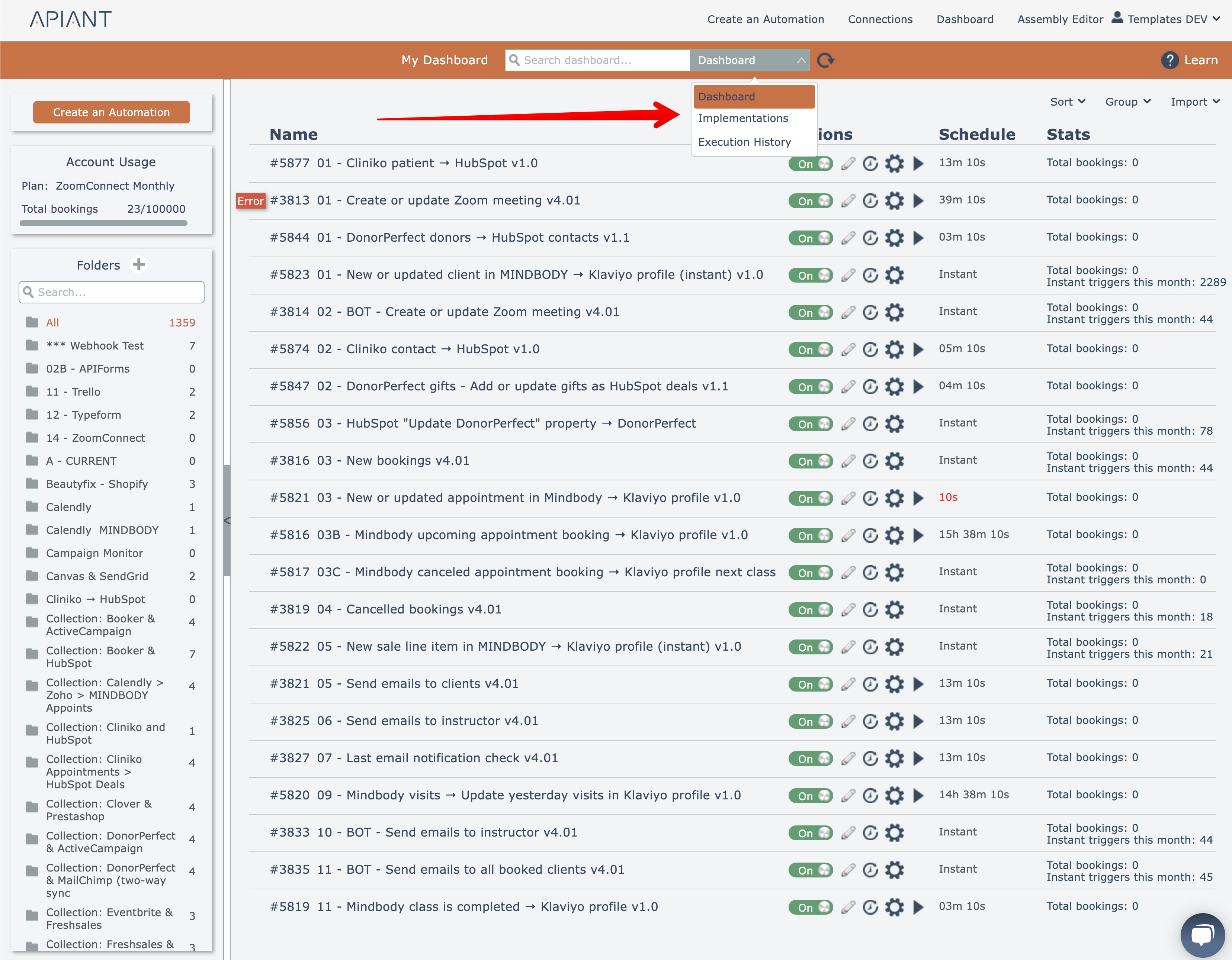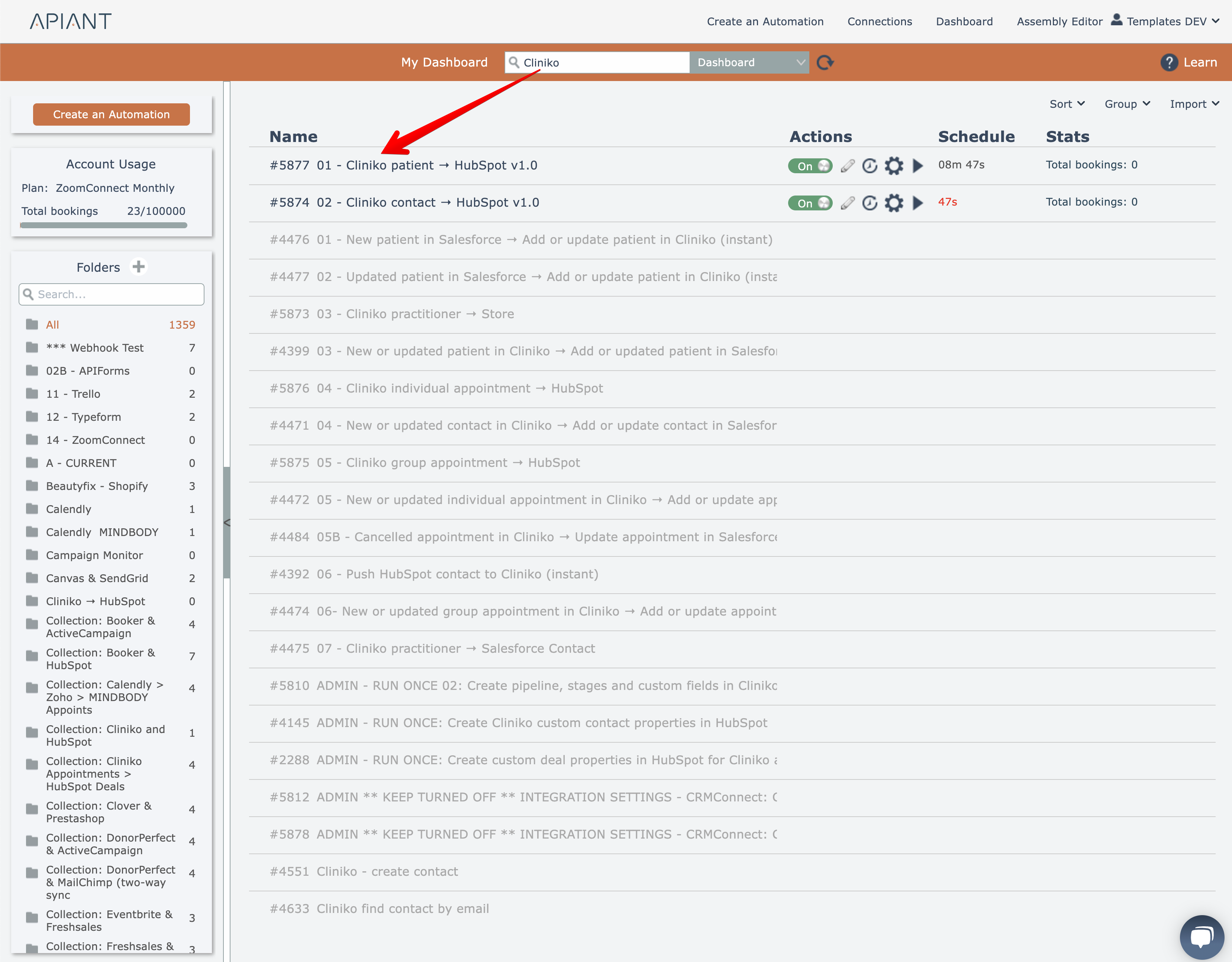 Learn how to search for automations in the dashboard list using multiple methods and find exactly what you need. This document includes step-by-step instructions and screenshots for searching by name, number, tag, implementation content, and execution his