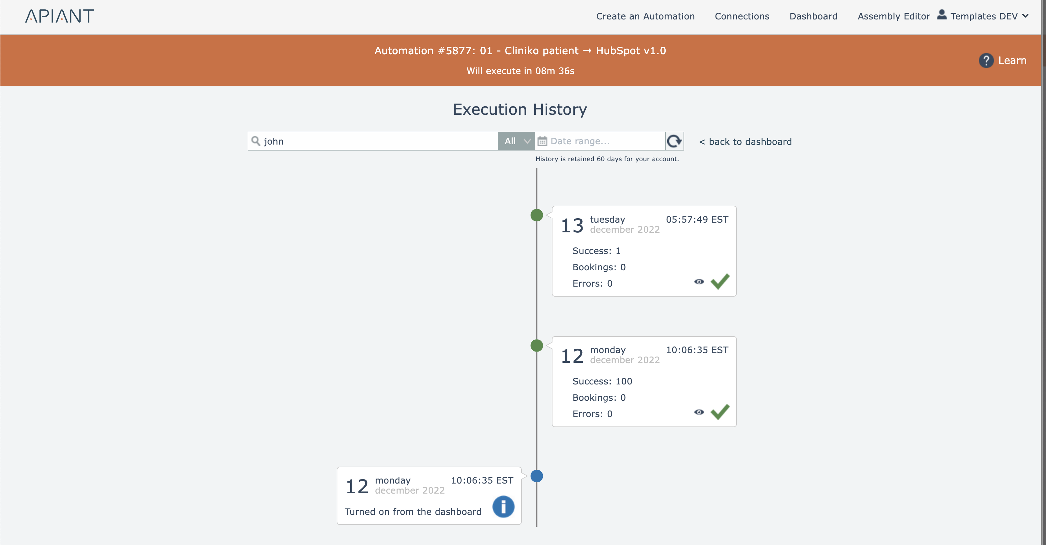 A dialog window will appear with all automations from the dashboard list that contain the search query in their execution history: