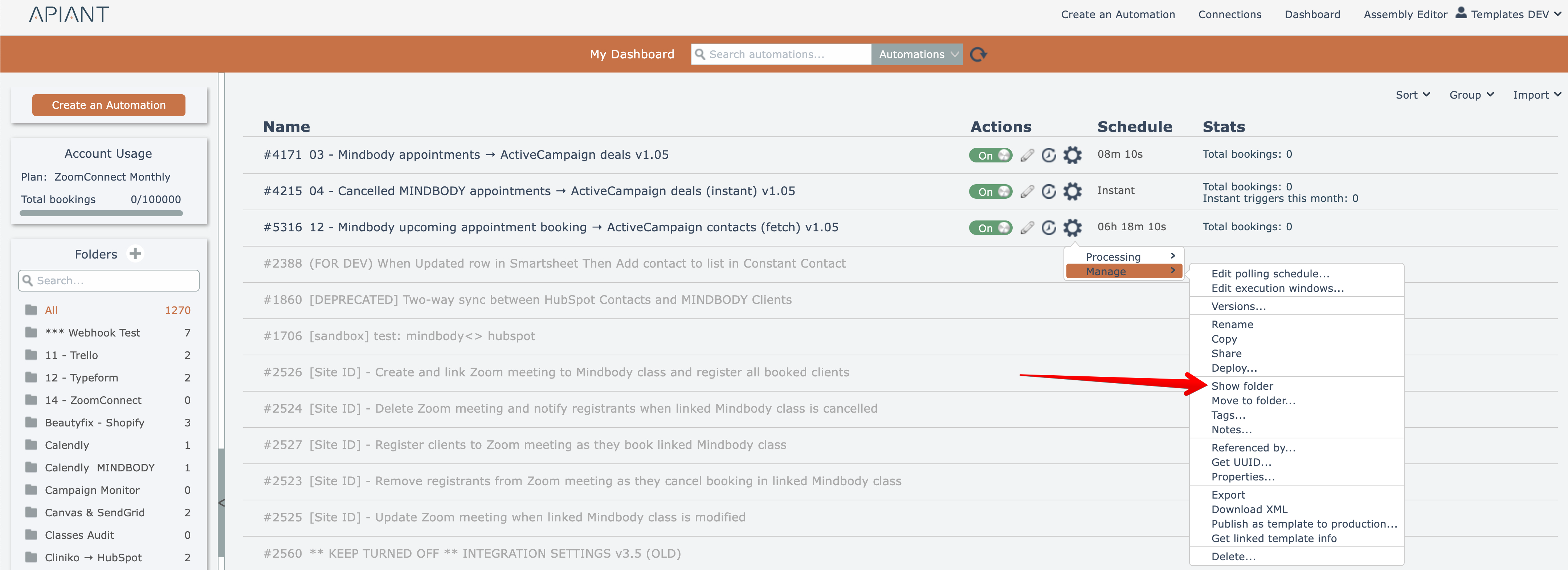 To view an automation's folder, choose this option from the gear menu: