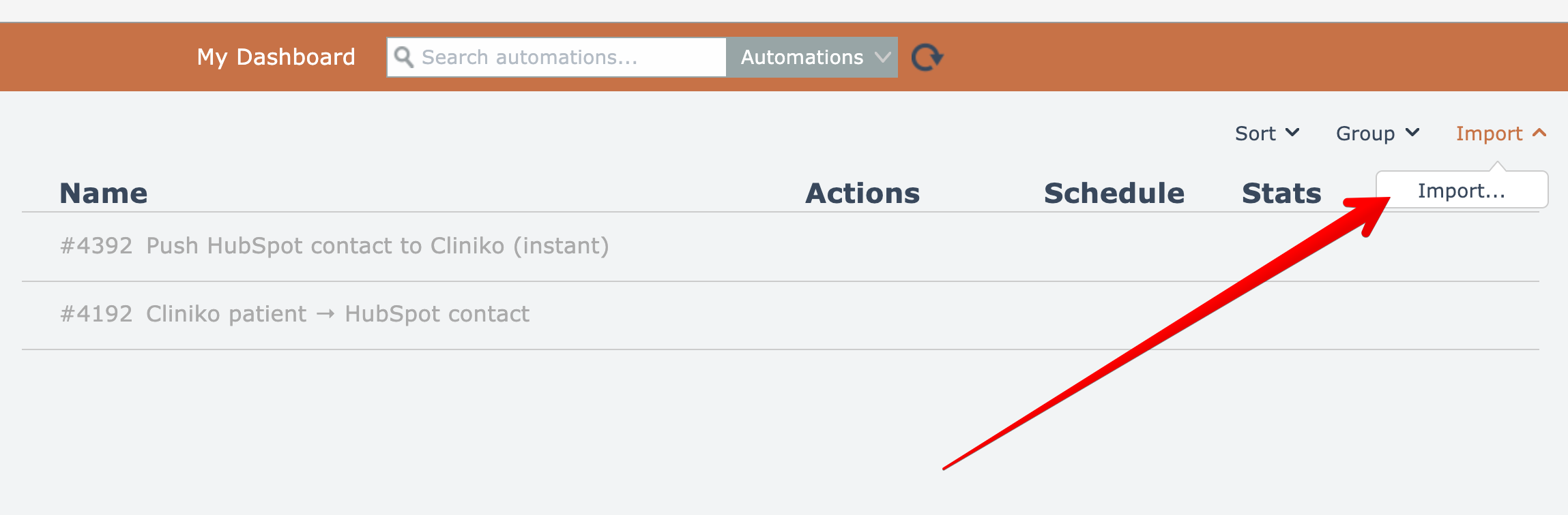 If you have a previously exported automation file and if your account has the "Import" permission, you can import that automation via the Import menu at the top right:
