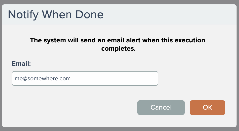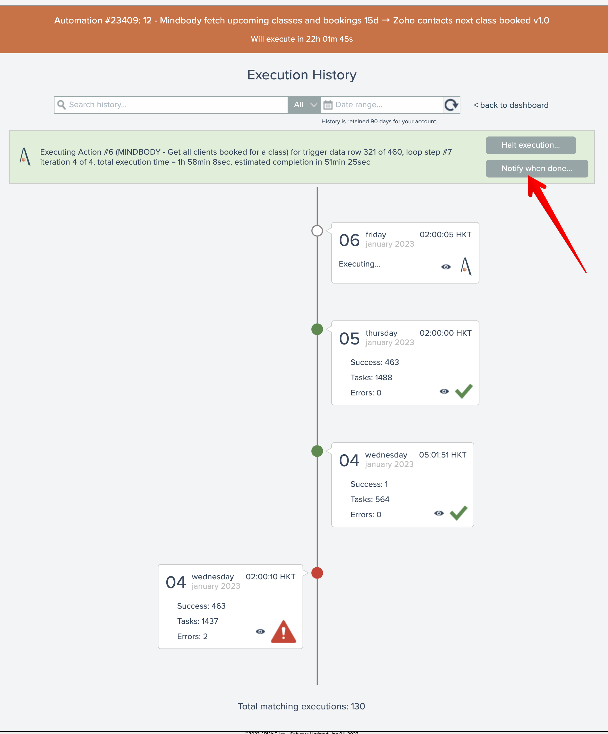 The system can notify you with an email alert when the current execution of an automation is finished. From the automation history screen, click the Notify button: