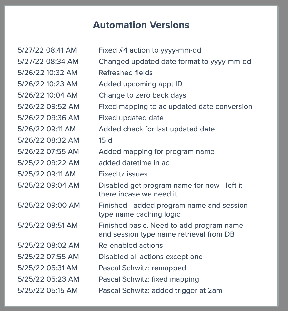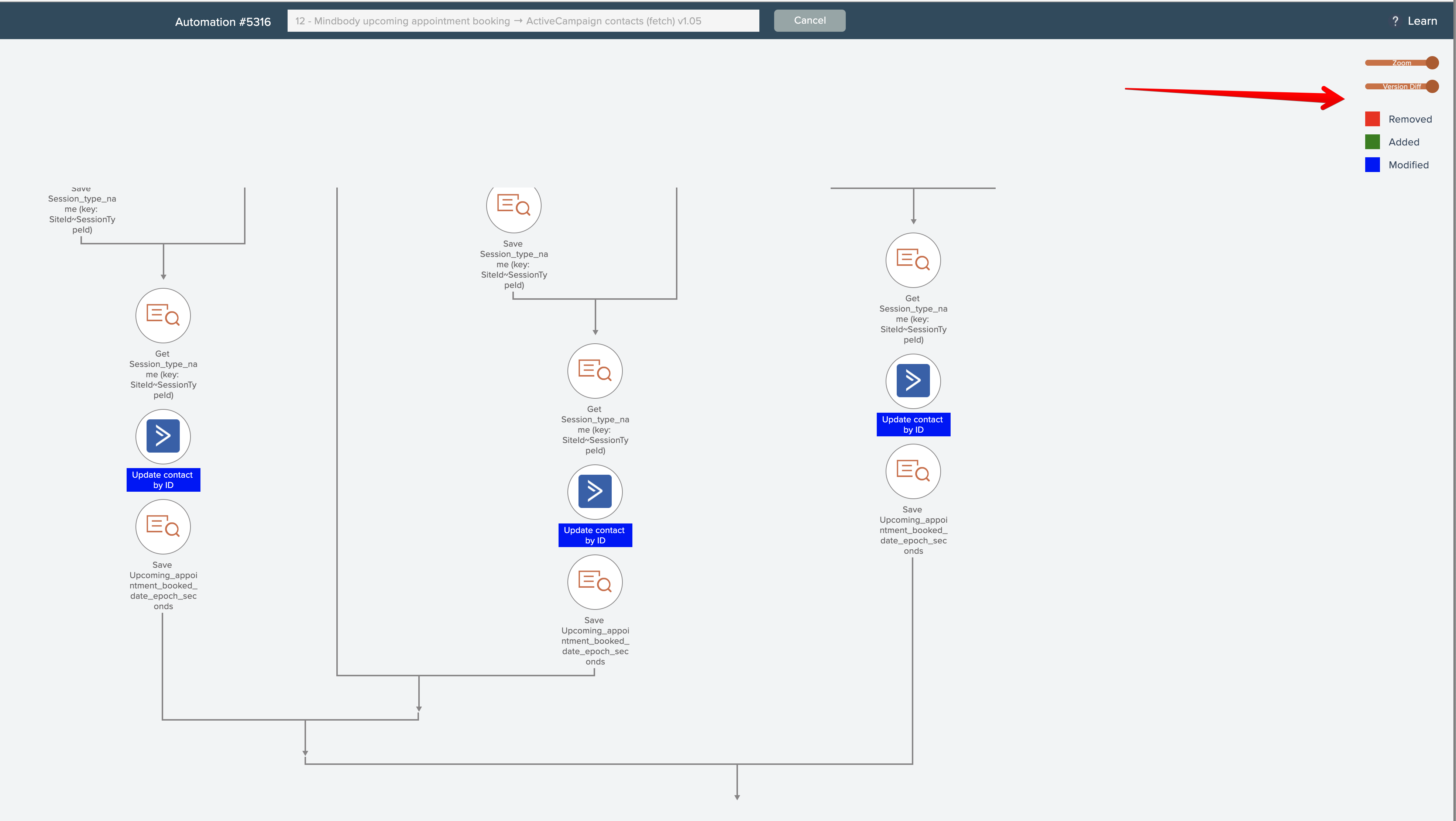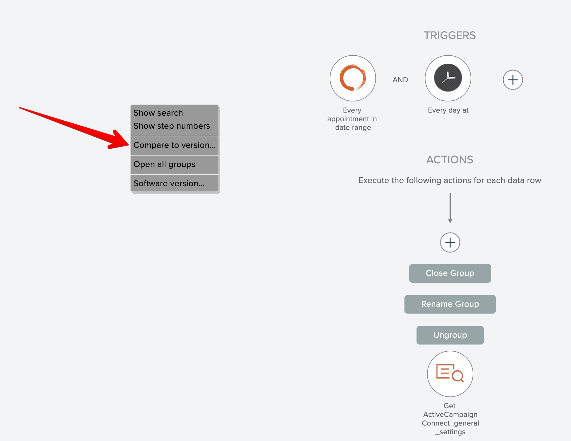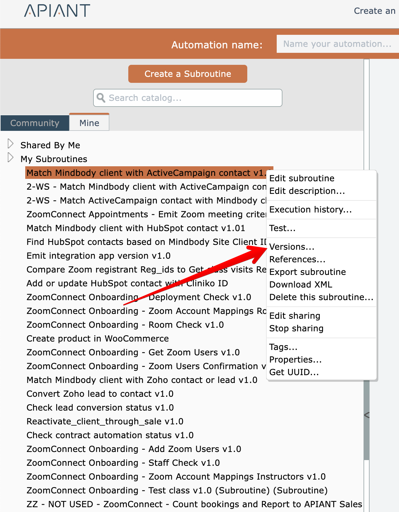 There are two ways to start a comparison. To compare the latest version of an automation with an earlier version, start by accessing the Versions menu option from the automation's gear icon: