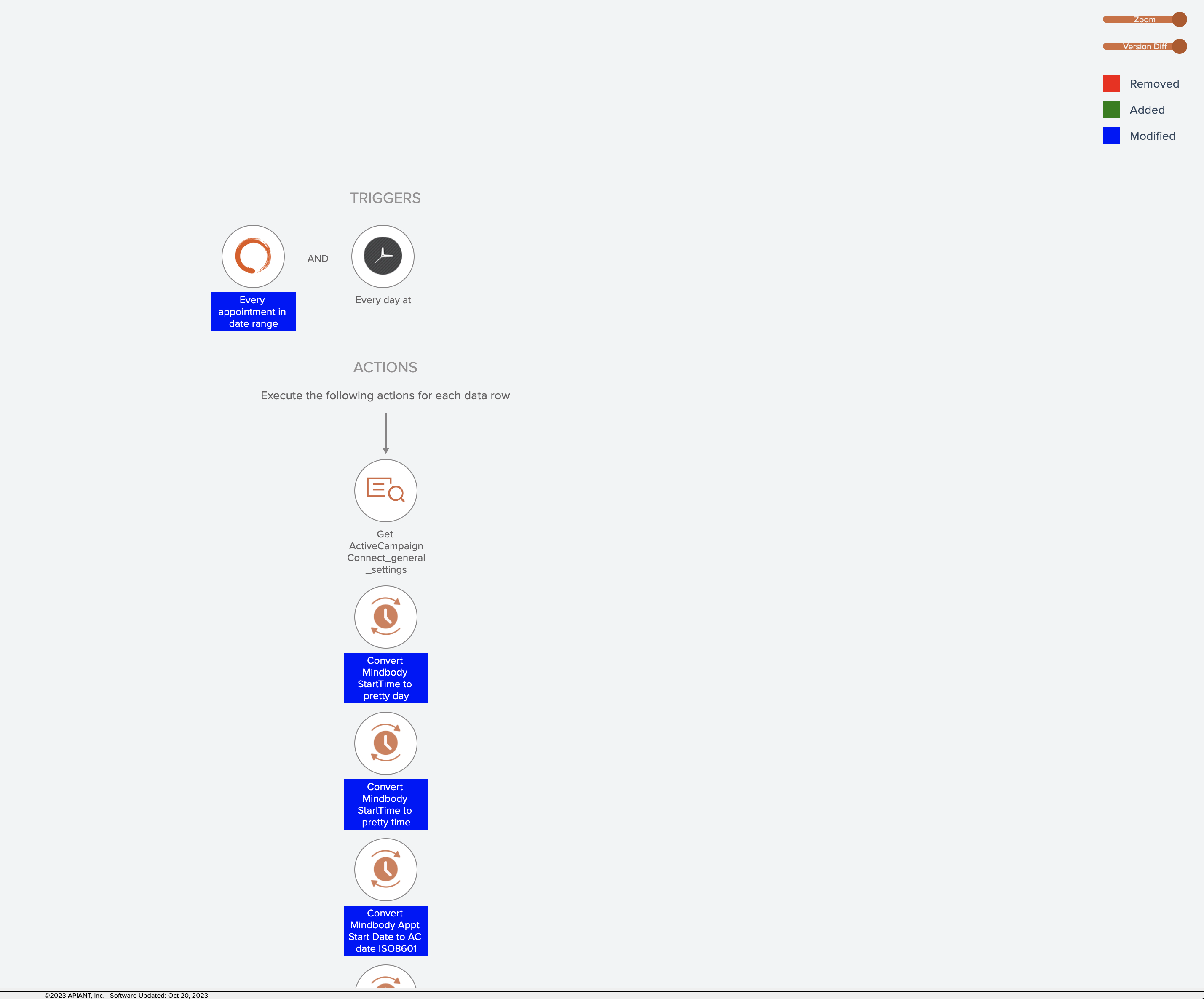 The latest version will open and display a slider at the top right. A legend also appears at the top right indicating the colors used to represent changes between the two versions: