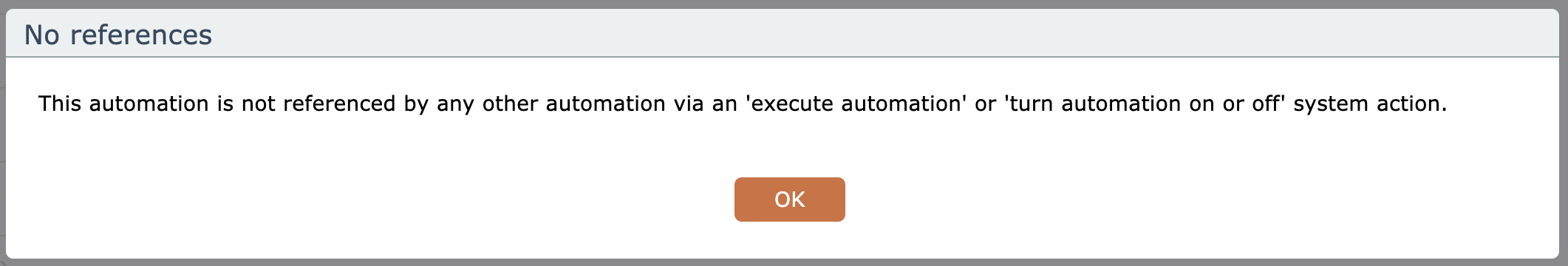 Learn how automations in this document can be executed and controlled using specific system actions. Discover how to check if an automation is referenced by another automation using the gear menu option. Be aware that there are alternative actions that ca