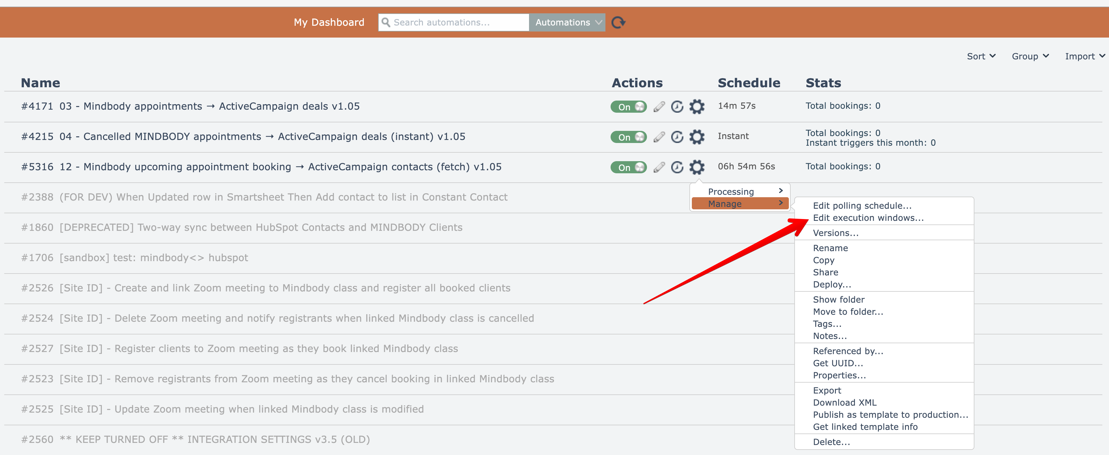 To edit an automation's execution windows, choose this gear menu option: