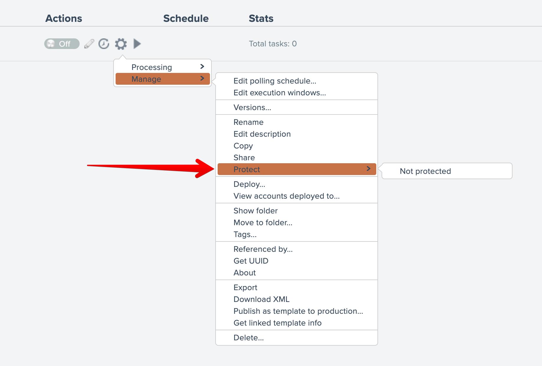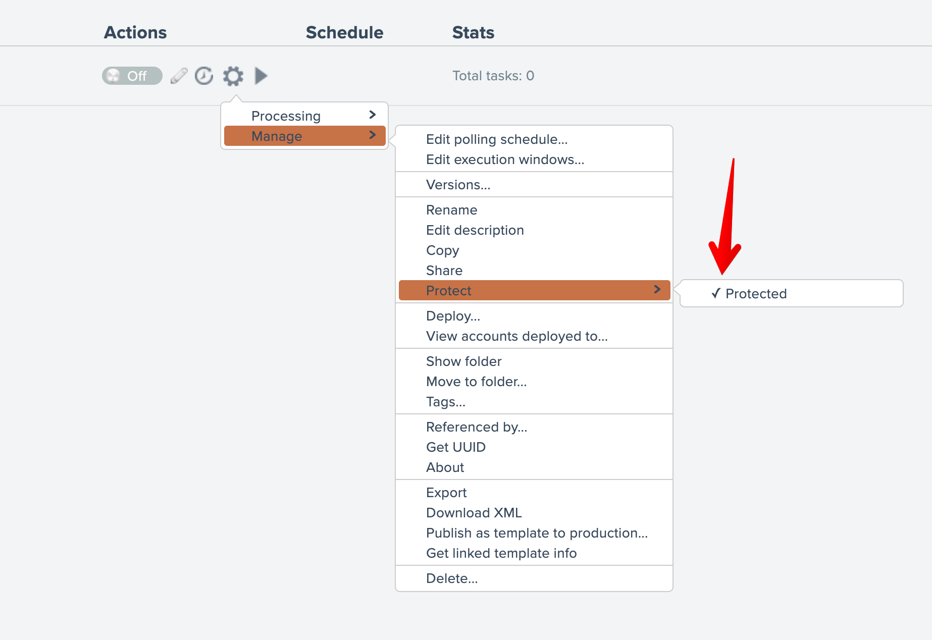 An automation can be protected so that it can only be edited on a development system. When a protected automation is published to production systems, it cannot be edited and its gear menu will not appear from any account on the production system.