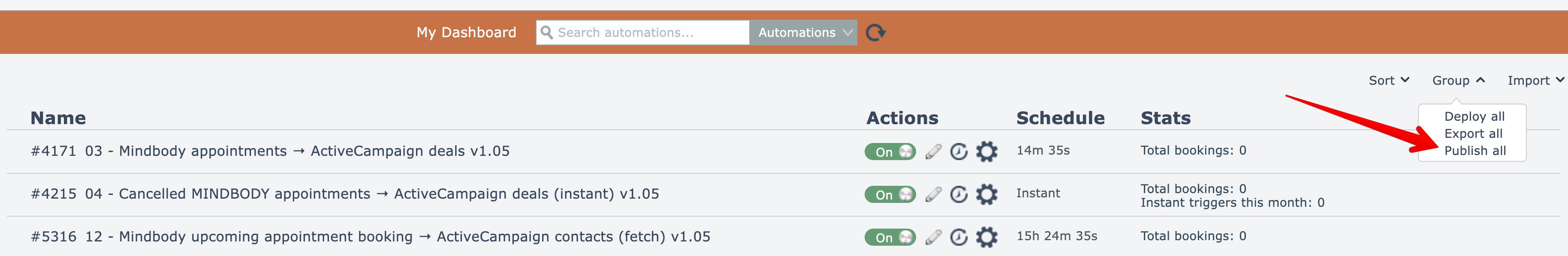 More than one automation can be published at once by first selecting a folder then choosing this option under the Group menu: