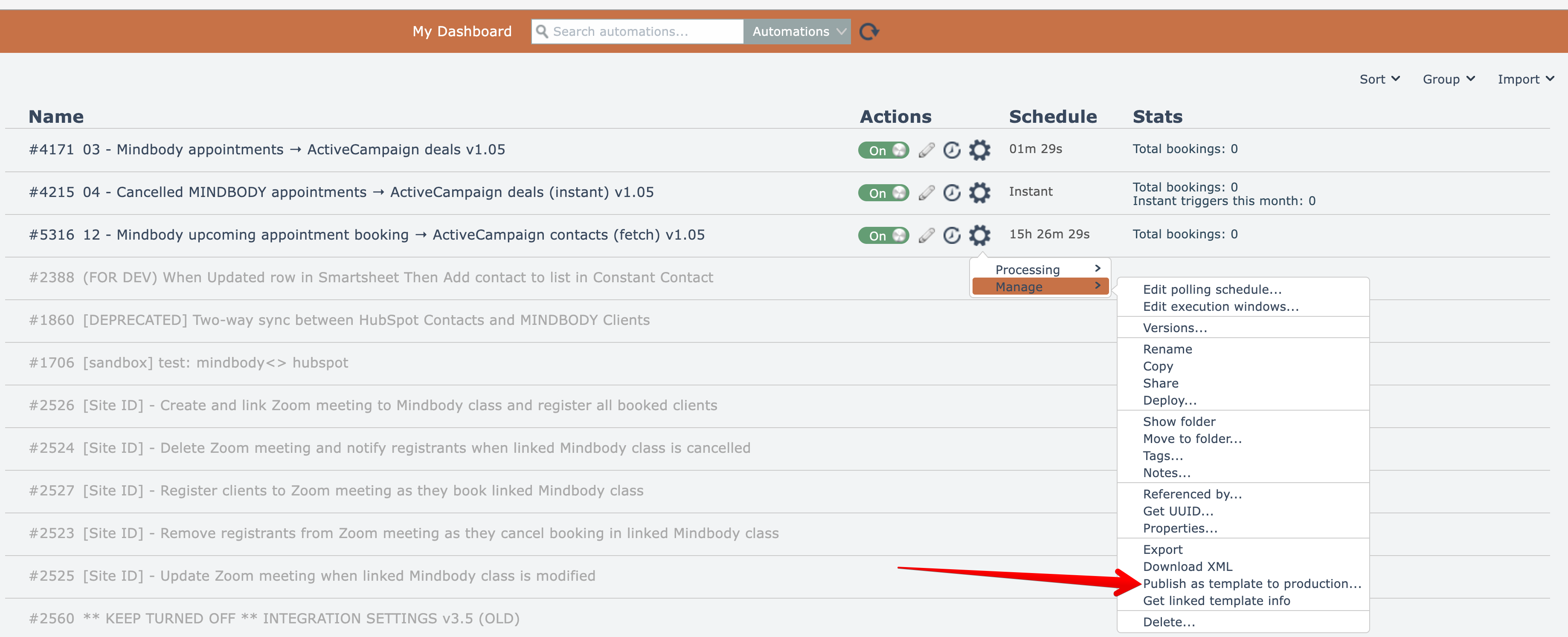 To publish an automation as a template from a development system to a production system, accounts having the "Publish to Production" permission can use the following gear menu option: