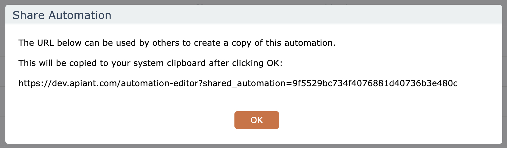 A URL will be provided and copied to your system clipboard. Provide that URL to the other account holder who you want to share the automation with:
