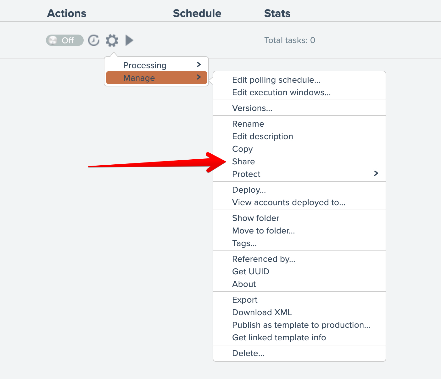An automation can be shared with another person who has a system account. That person will be able to save their own copy of the shared automation. To share an automation, choose the Share option from the gear menu: