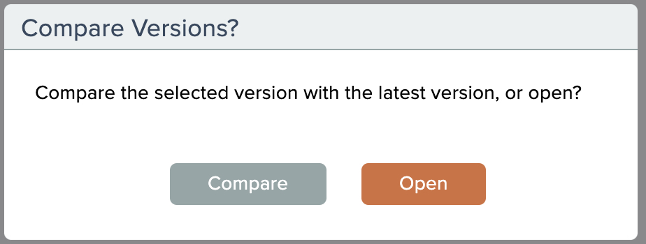 Upon clicking a version from the list, the system will ask if you want to open that version, or to compare that version with the latest version: