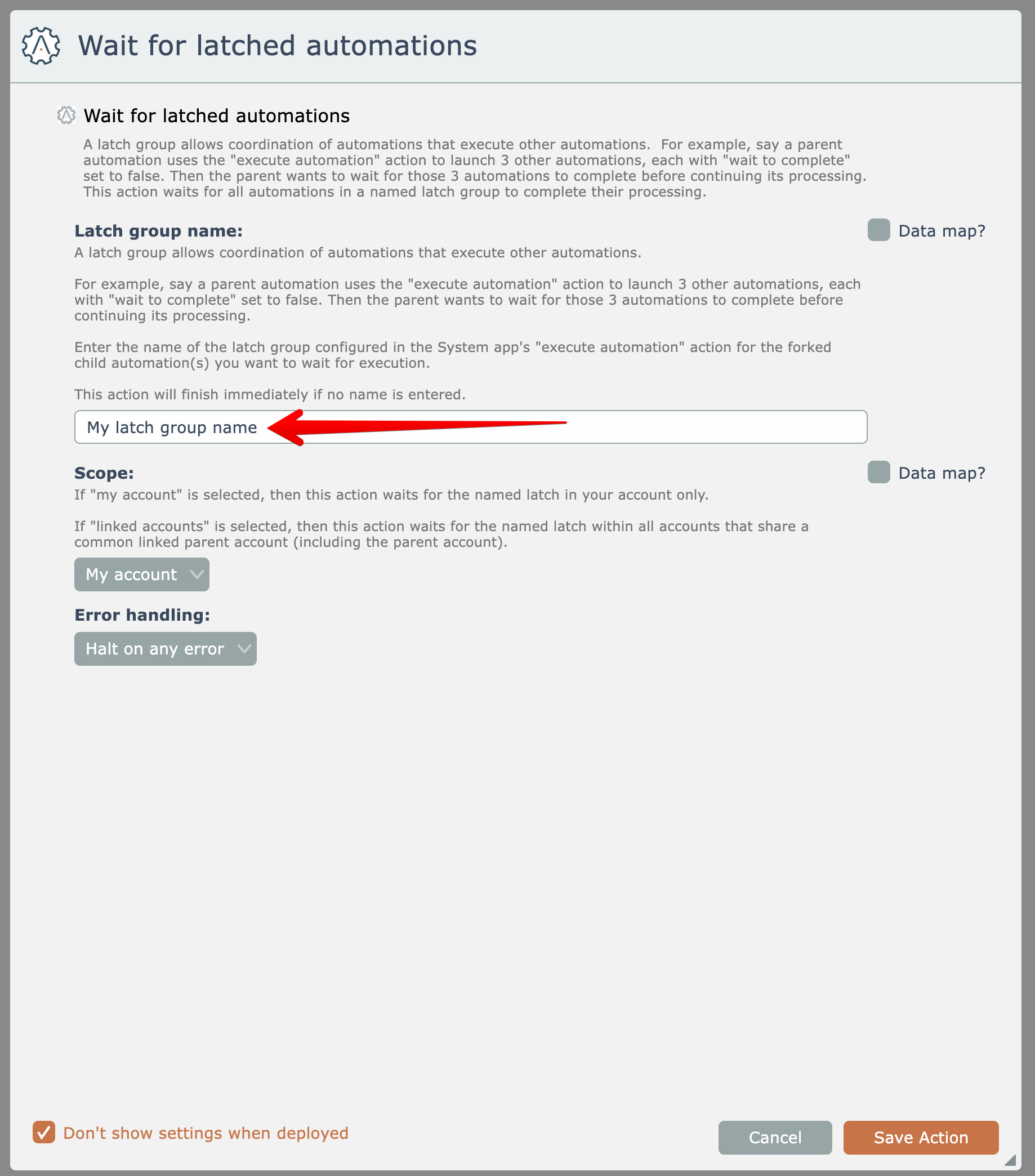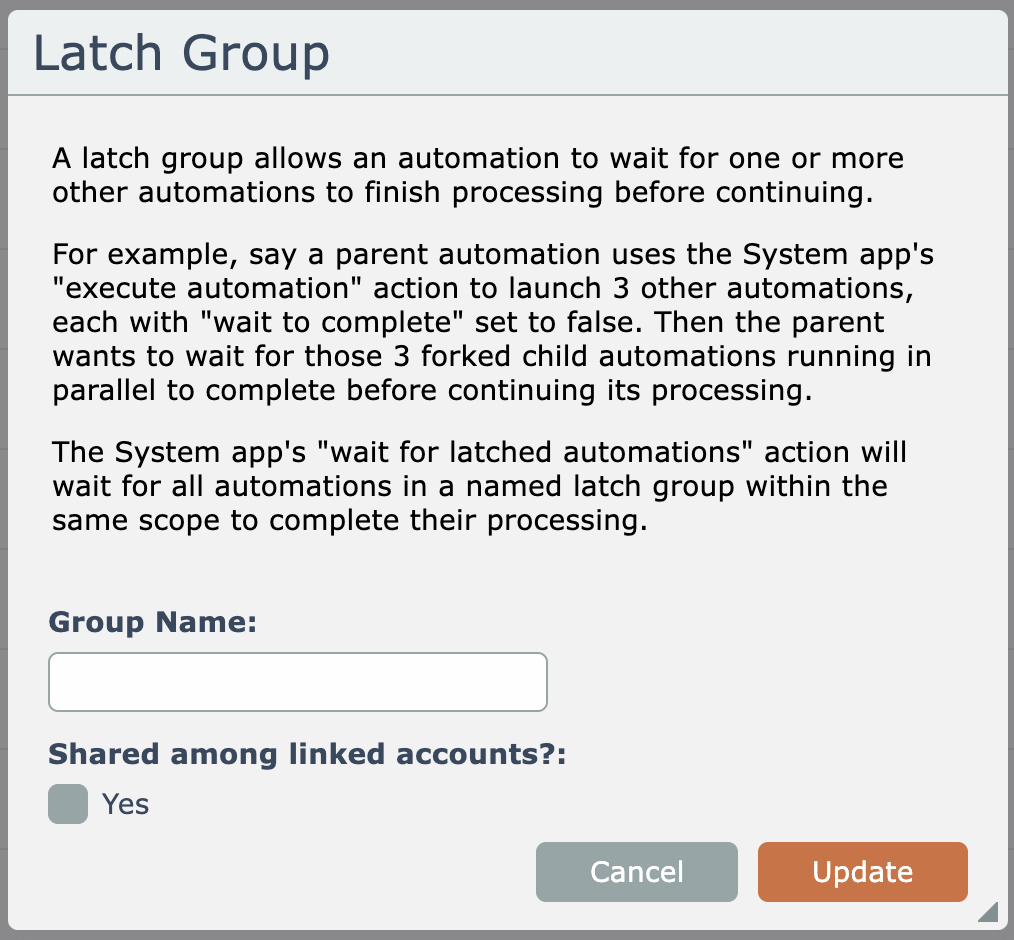 Latch groups can optionally be shared across linked accounts. That means that a parent automation in a parent account can execute child automations across multiple linked child accounts and wait for those child automations to finish.