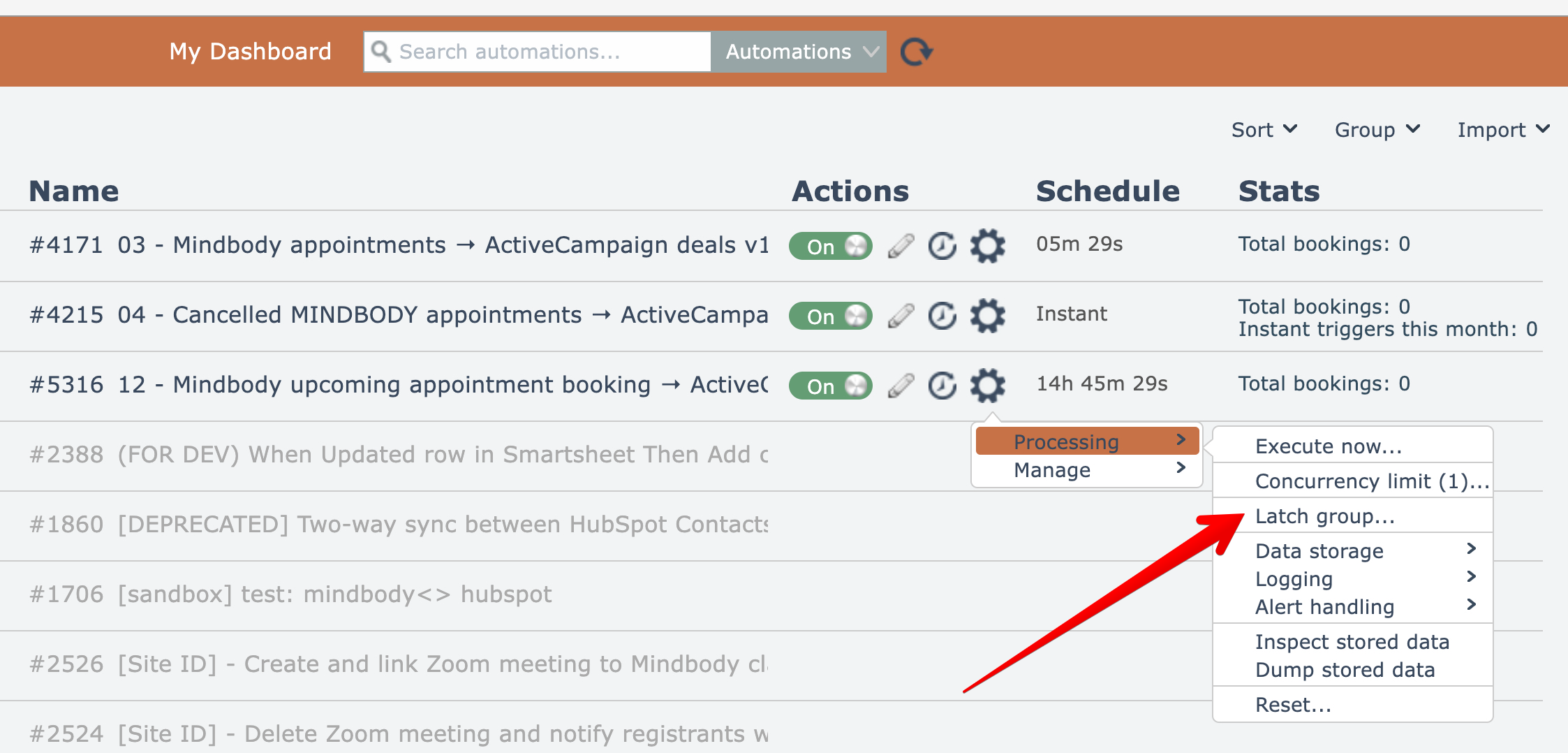 To accomplish this, each child automation is first placed into the same Latch Group via their gear menu option here: