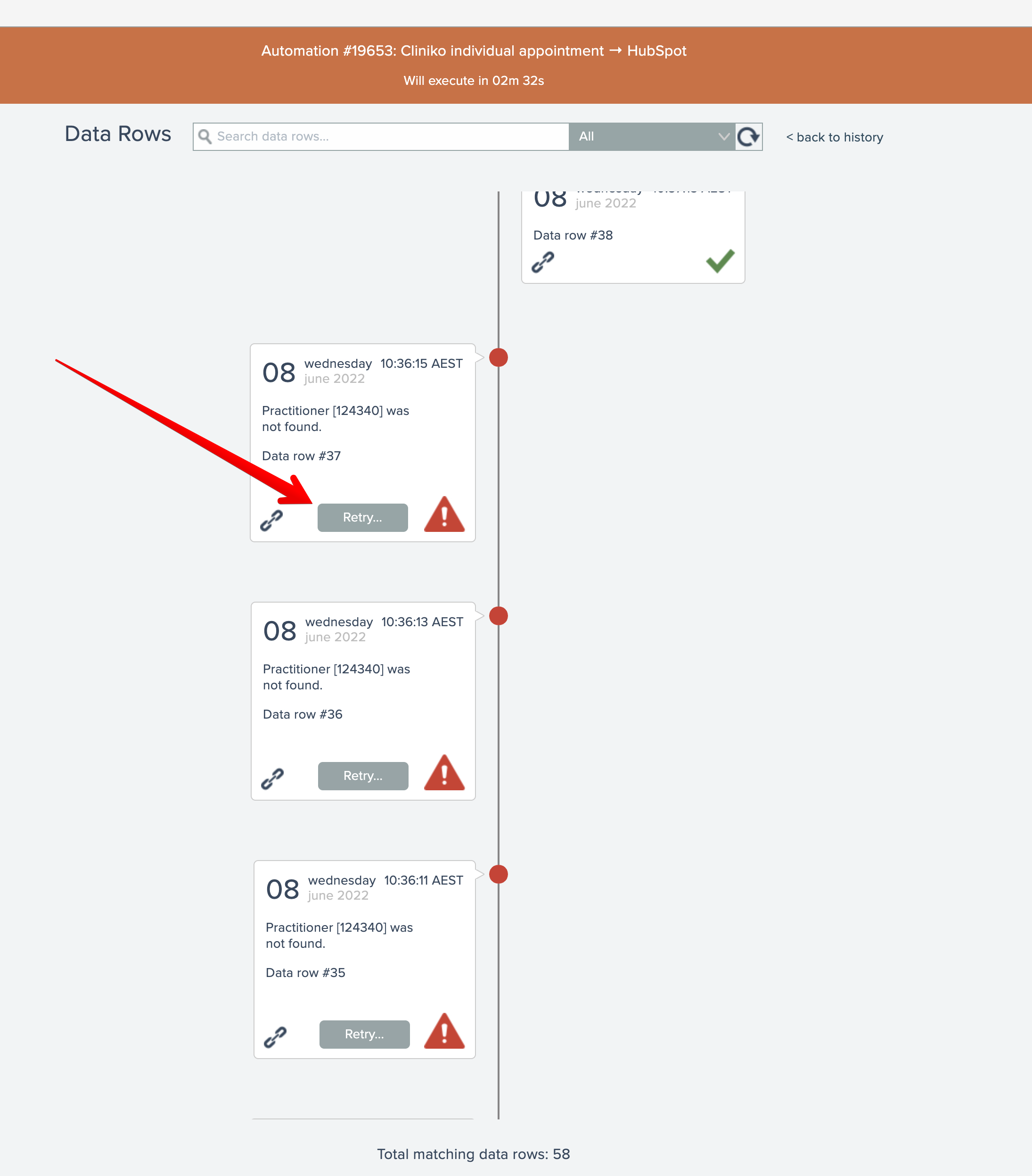 From the second-level data row history screen, individual errored data rows can be retried by clicking their Retry button: