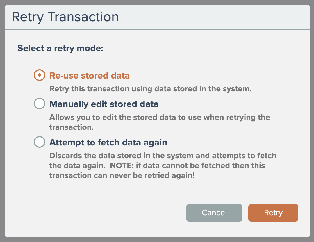 The system can re-use the existing stored data to perform the retry, you can manually edit the stored data, or the system can attempt to fetch the data again from the trigger(s).