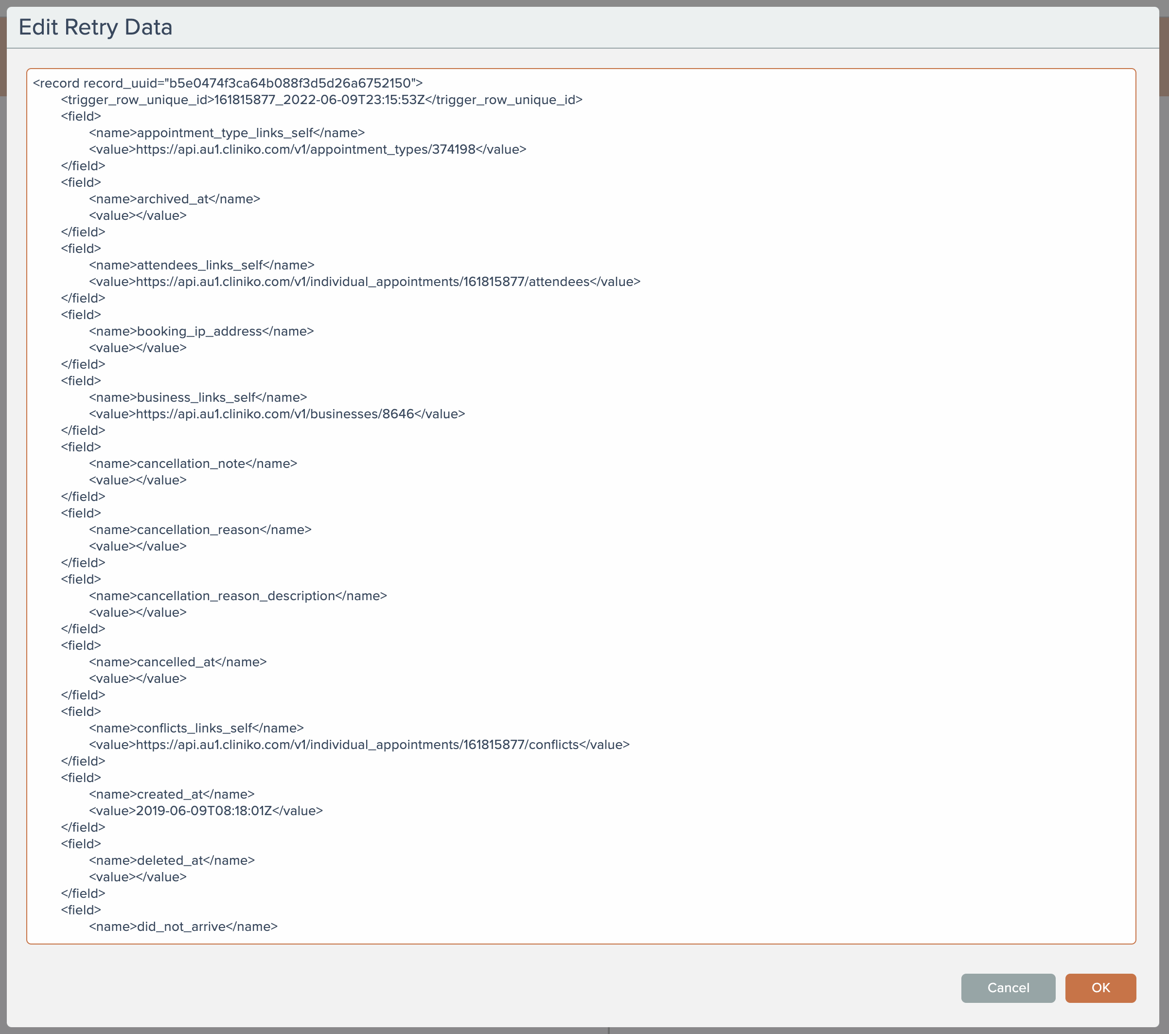 Selecting to manually edit the stored data will show a text editor where the trigger data row record can be edited: