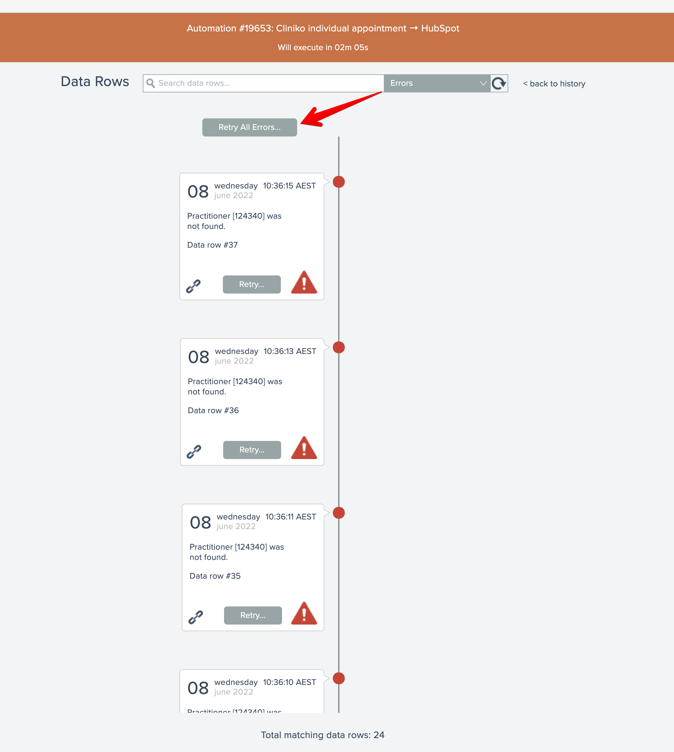 1From the second-level data row history screen, multiple errored data rows can be retried by first selecting the Error filter. If multiple data rows are returned the Retry All button will appear: