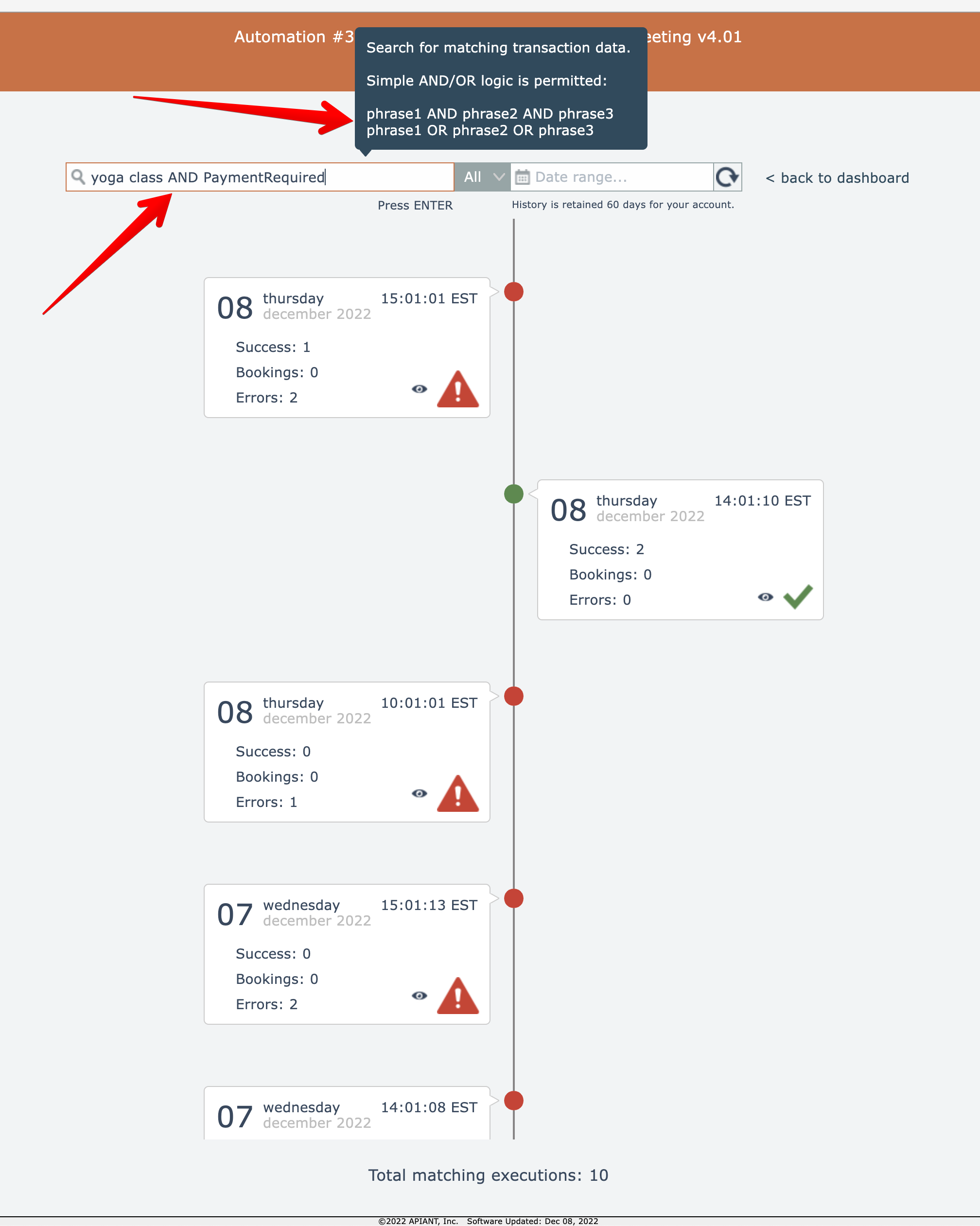 Execution history is searchable. Simple AND/OR logic can be used: