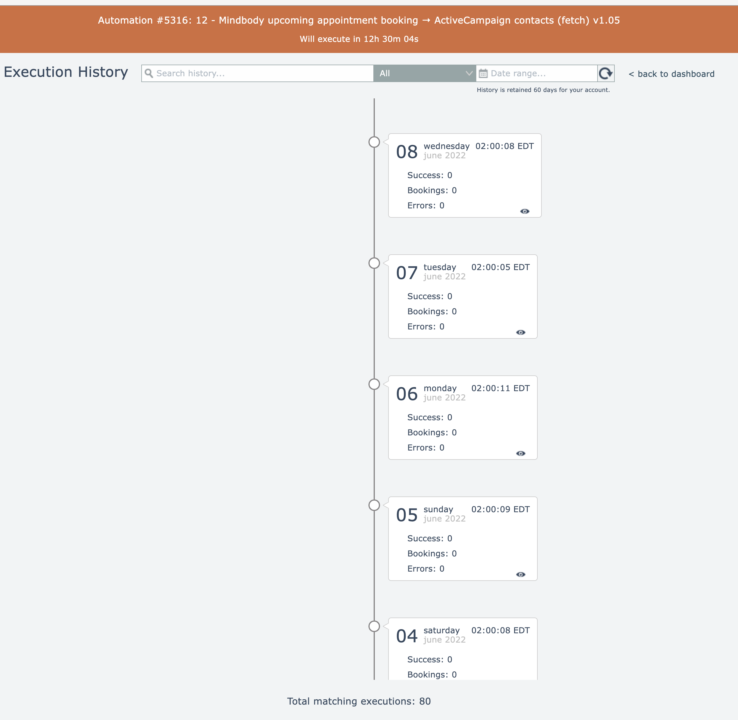Each time an automation is executed, the results of the execution are recorded in its execution history:
