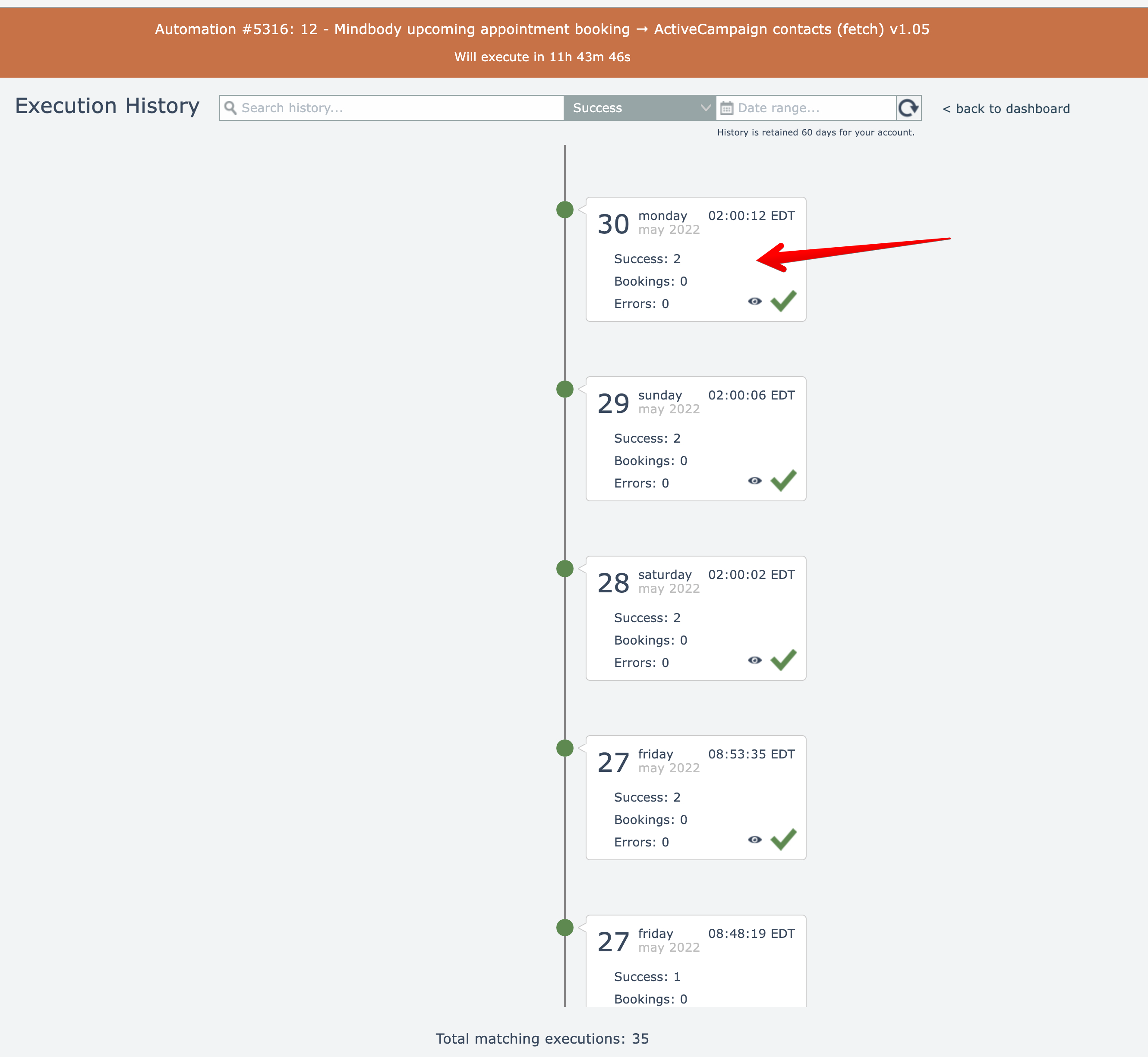 Execution history is the top-level screen. Each entry represents an execution of the automation.